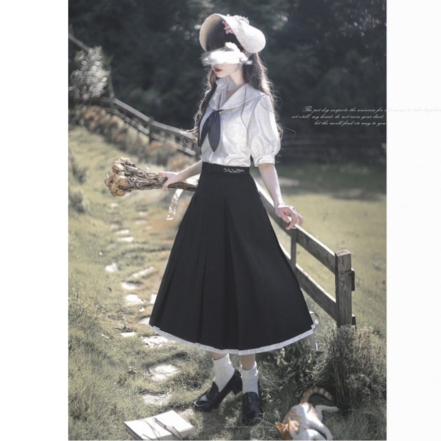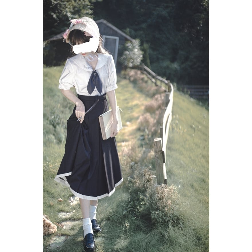 ブラウスは柔らかな生地に、フリルと刺繍で彩られた大きめのセーラー襟が特徴です。取り外し可能なリボンタイで表情を変えられます。