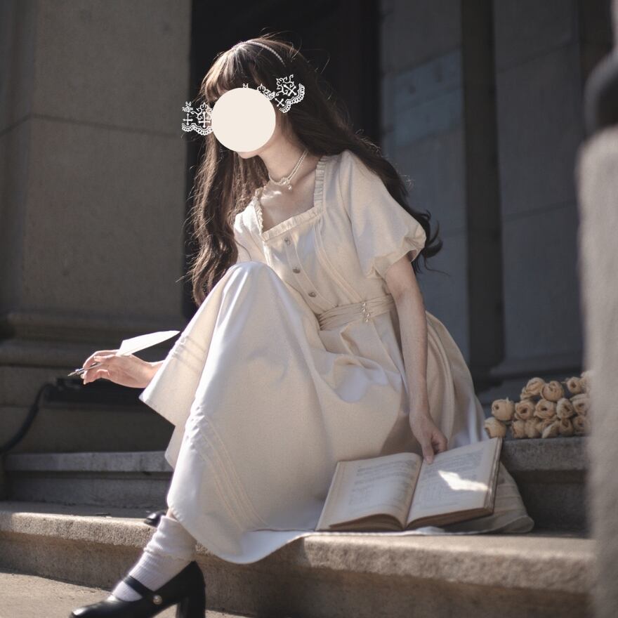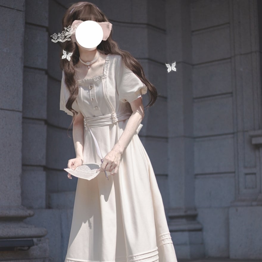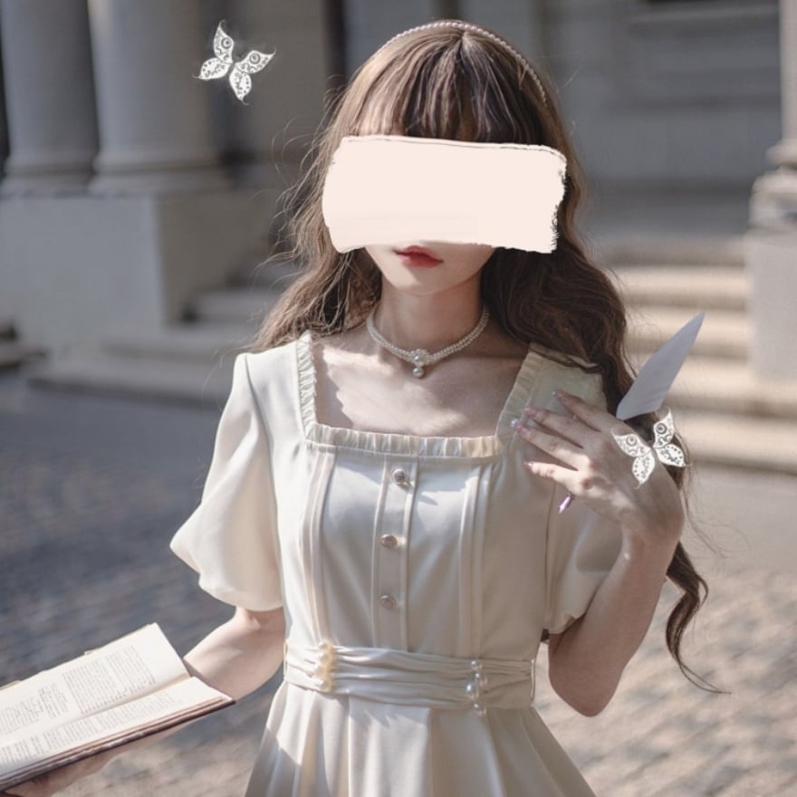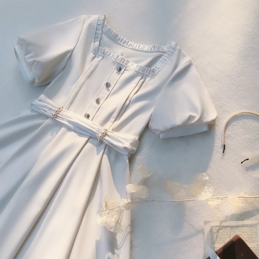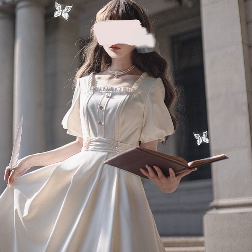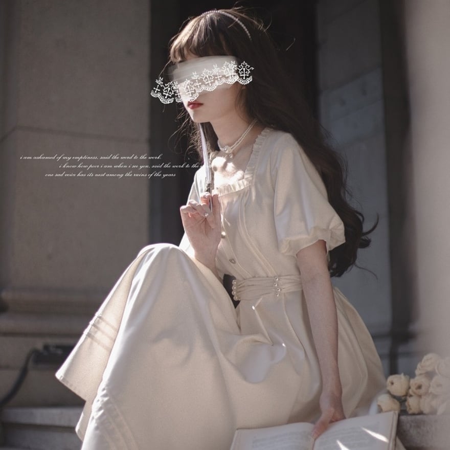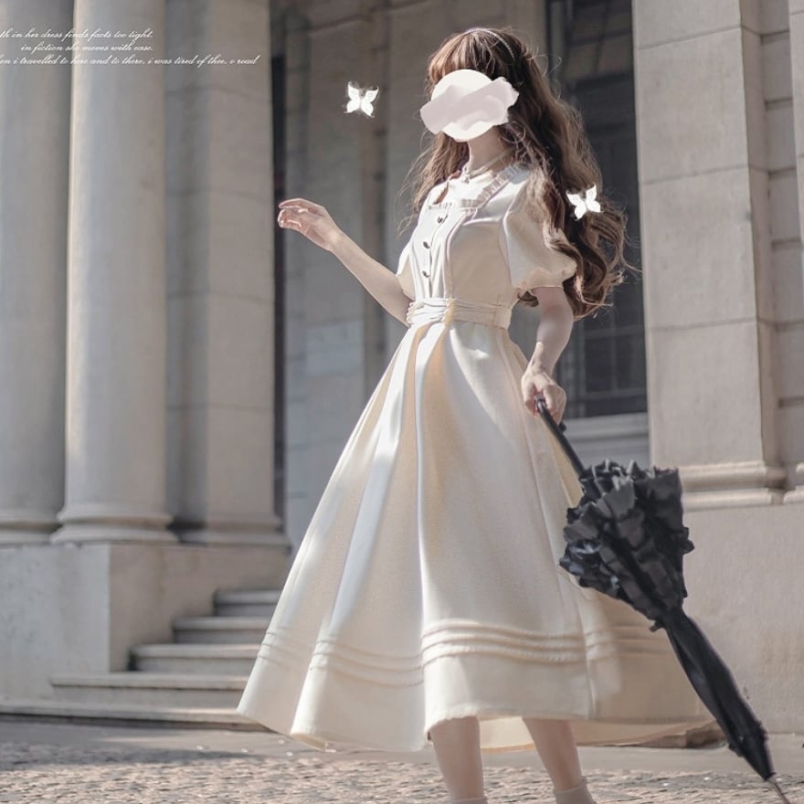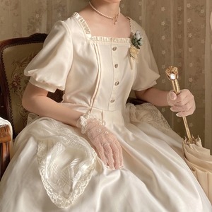 ふんわりとしたパフスリーブと、繊細なフリルが上品な甘さを添え、知性と可愛らしさを引き立てます。