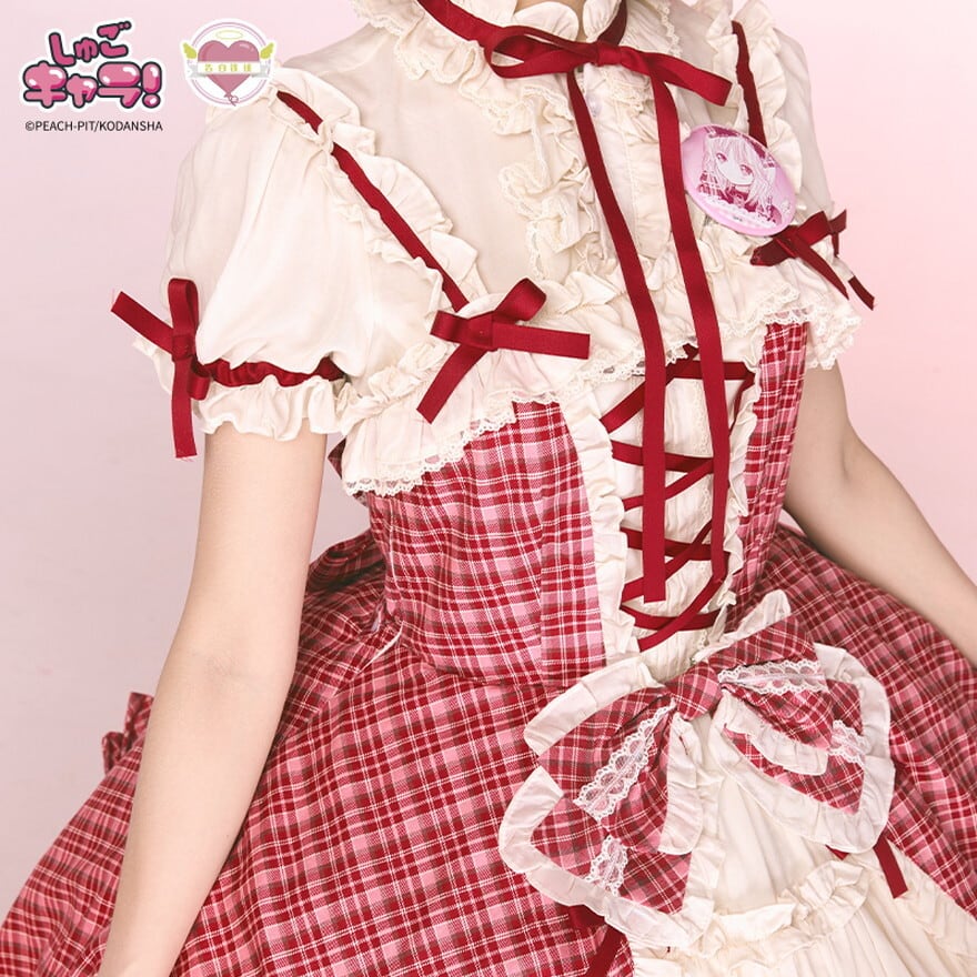 ご紹介するブラウスはパフスリーブの袖口にもフリルが施され、全体に甘く柔らかな雰囲気でジャンパースカートは、赤と黒のチェック柄が目を引く、パンクテイストもミックスされたアイドルロリィタスタイルです。