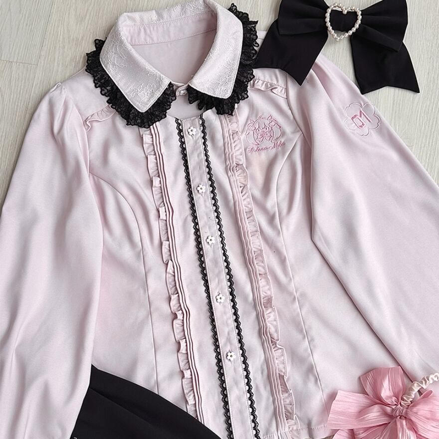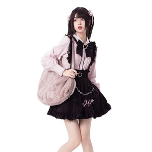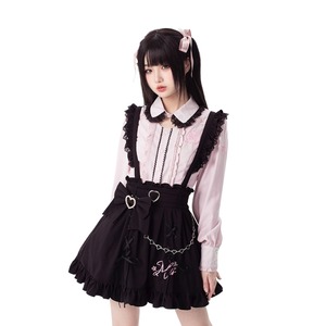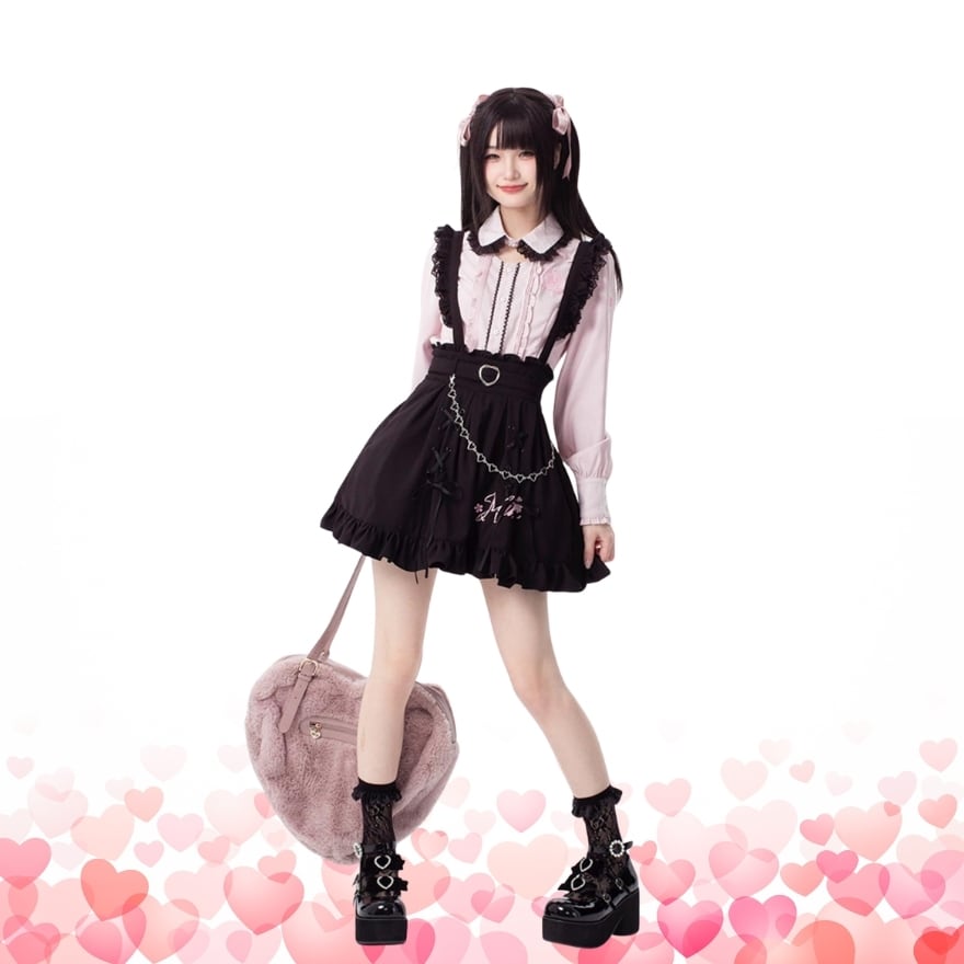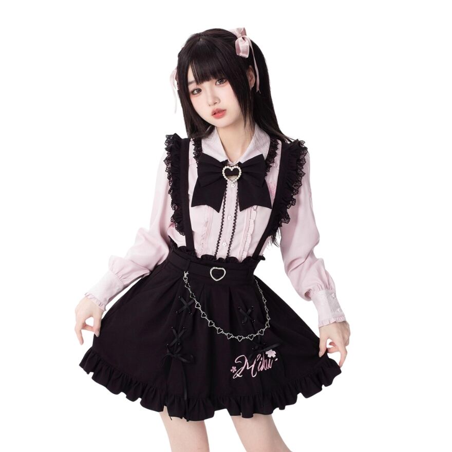 ロリィタの甘さと地雷系のクールさが絶妙に融合した長袖ブラウスとフリルやリボンといった甘めなスカートのセットアップになります。地雷系ならではの甘辛MIXデザインが魅力です。
