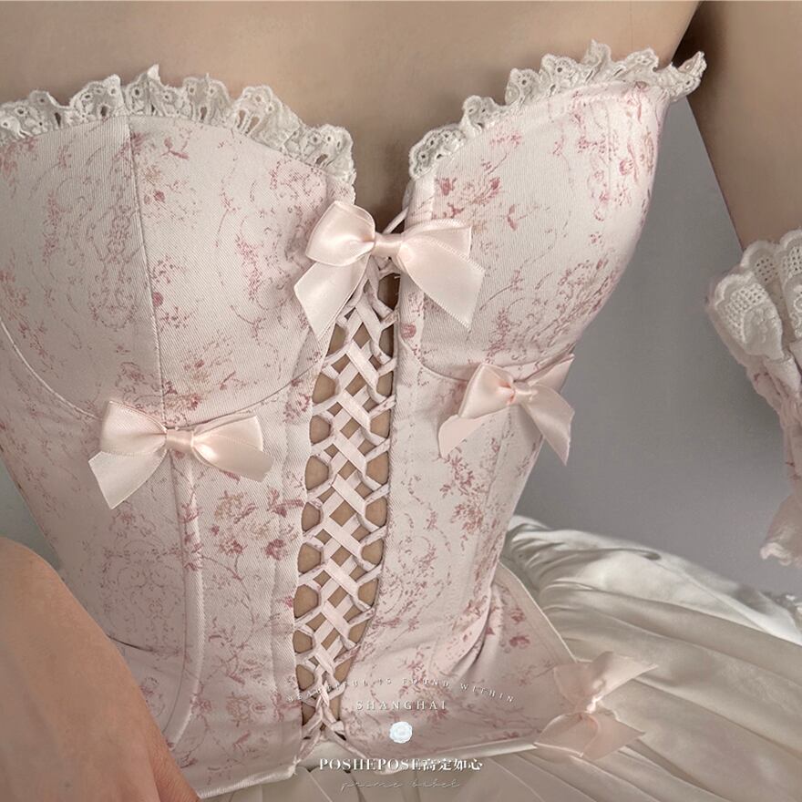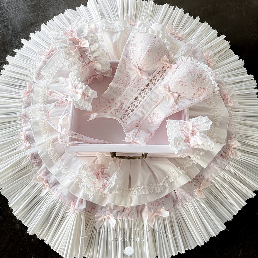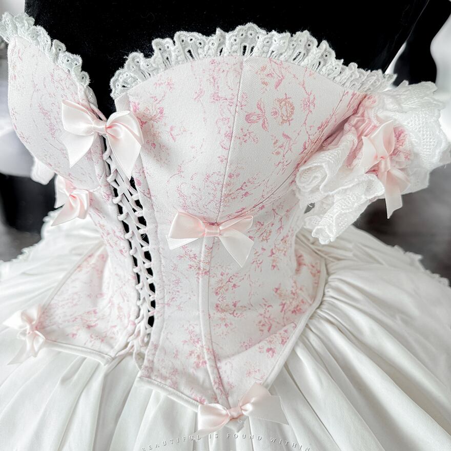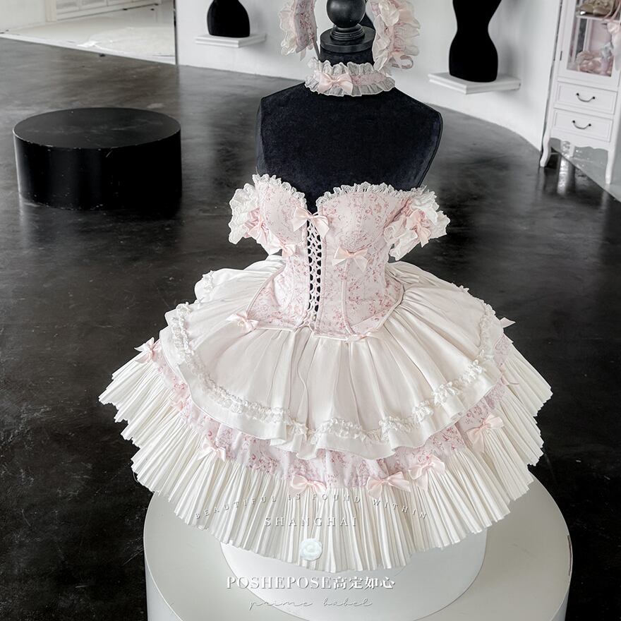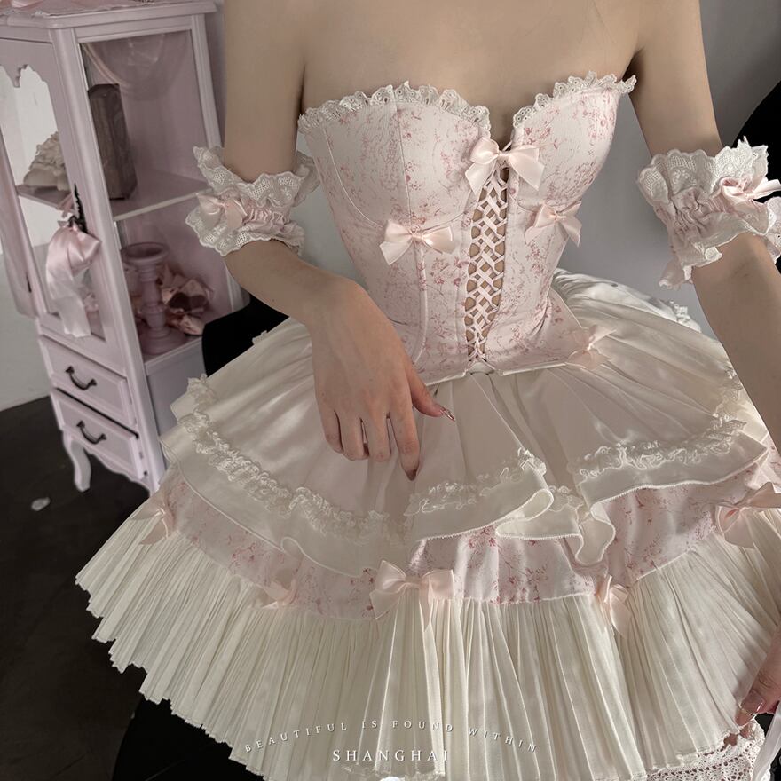 淡いピンクの小花柄のコルセットトップスに、ホワイトのプリーツスカートが組み合わされたロリータドレスです。