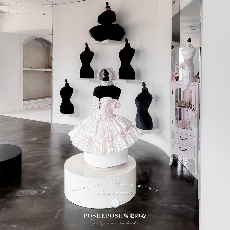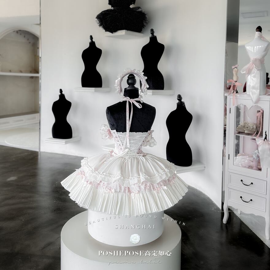 コルセットのフロントには編み上げとリボンがあしらわれ、スカートはプリーツとフリル、そして可愛らしいリボンが何層にも重なり、ふんわりと広がっています。