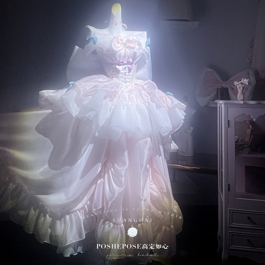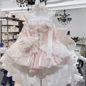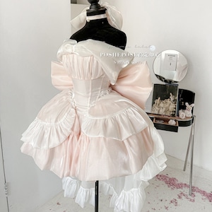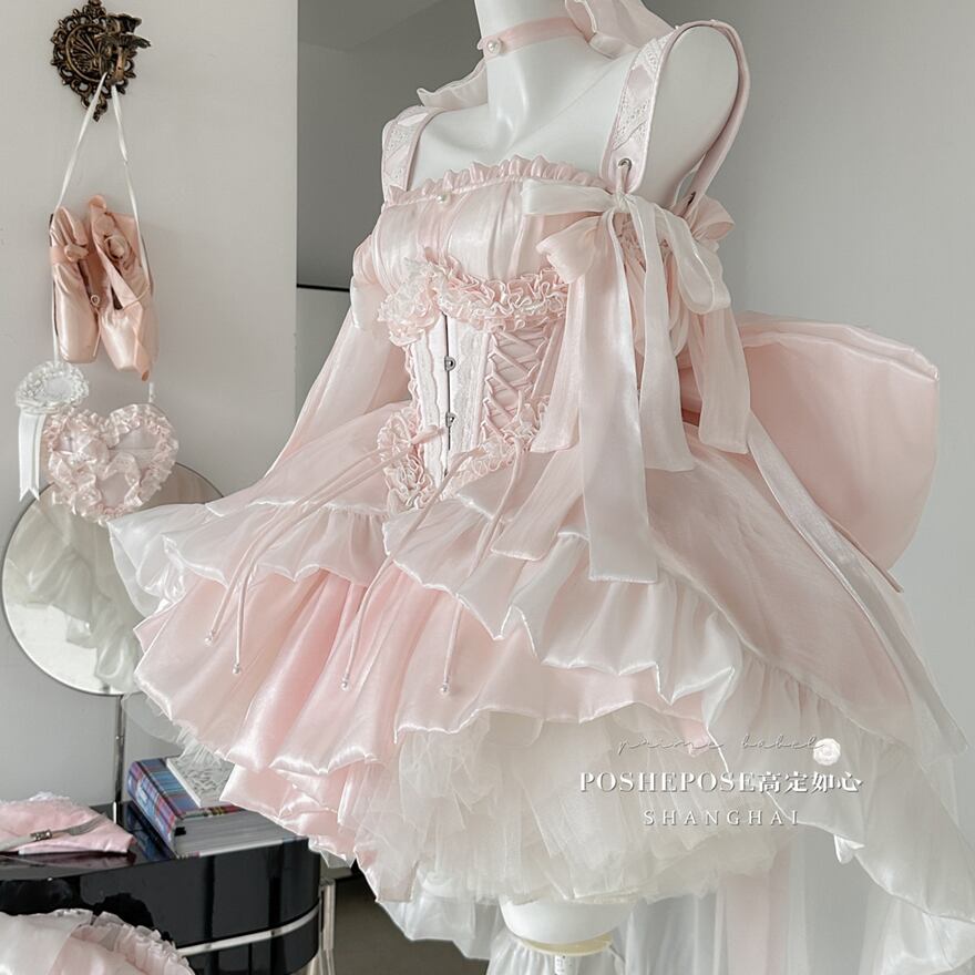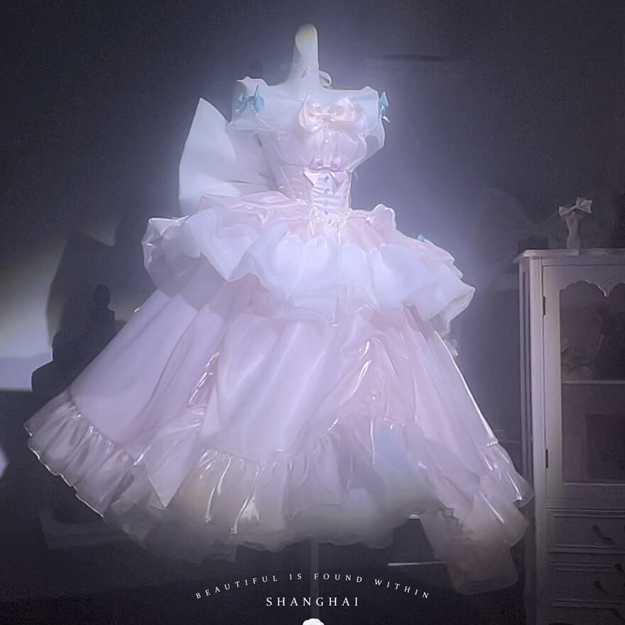 ウエストをコルセットのように絞り、スカートは幾重にも重なるフリルがふんわりと広がり、ドーリーで可愛らしいシルエットを演出します。肩や袖元には大きなリボンが飾られ、華やかさを添えています。