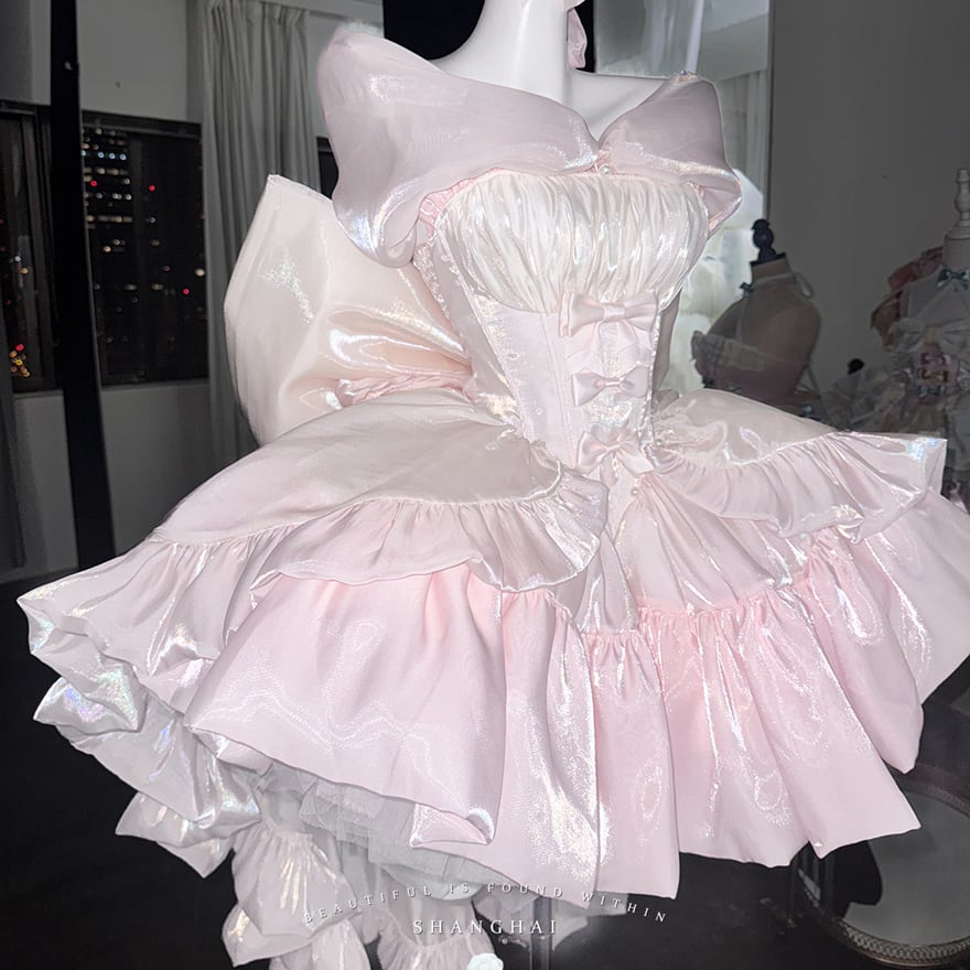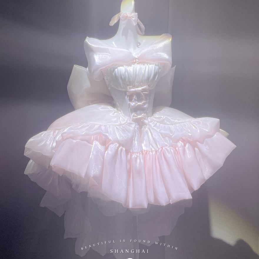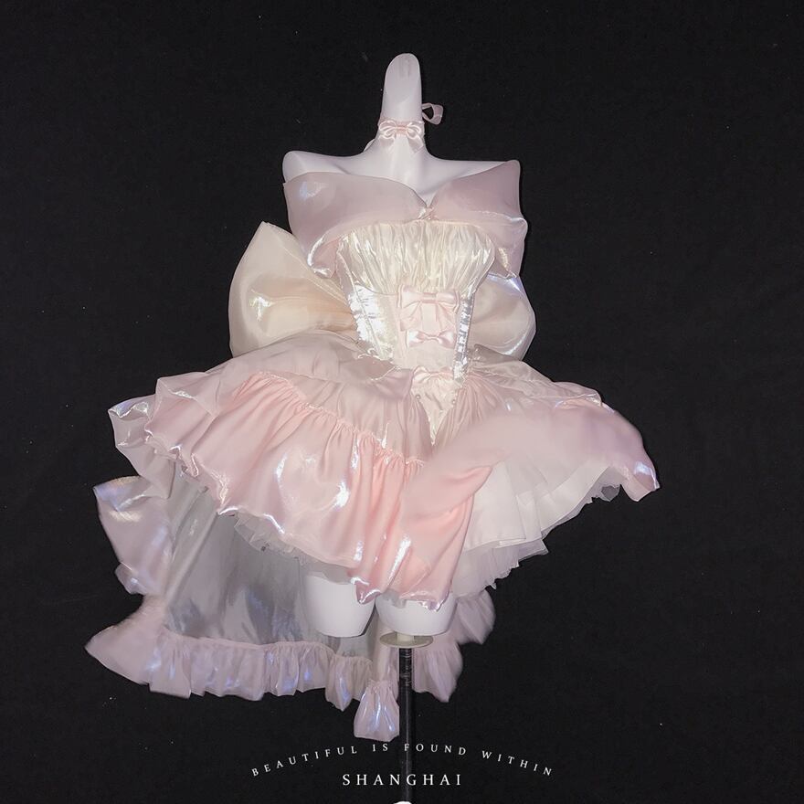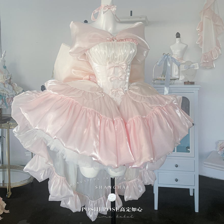 ウエスト部分にはホワイトのコルセットデザインが施され、可愛らしいリボンがアクセントになっています。肩には大きなリボンが配され、後ろにも大きなリボンがあしらわれていることで、どこから見ても華やかな印象を与えます。