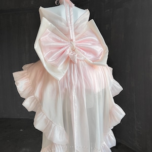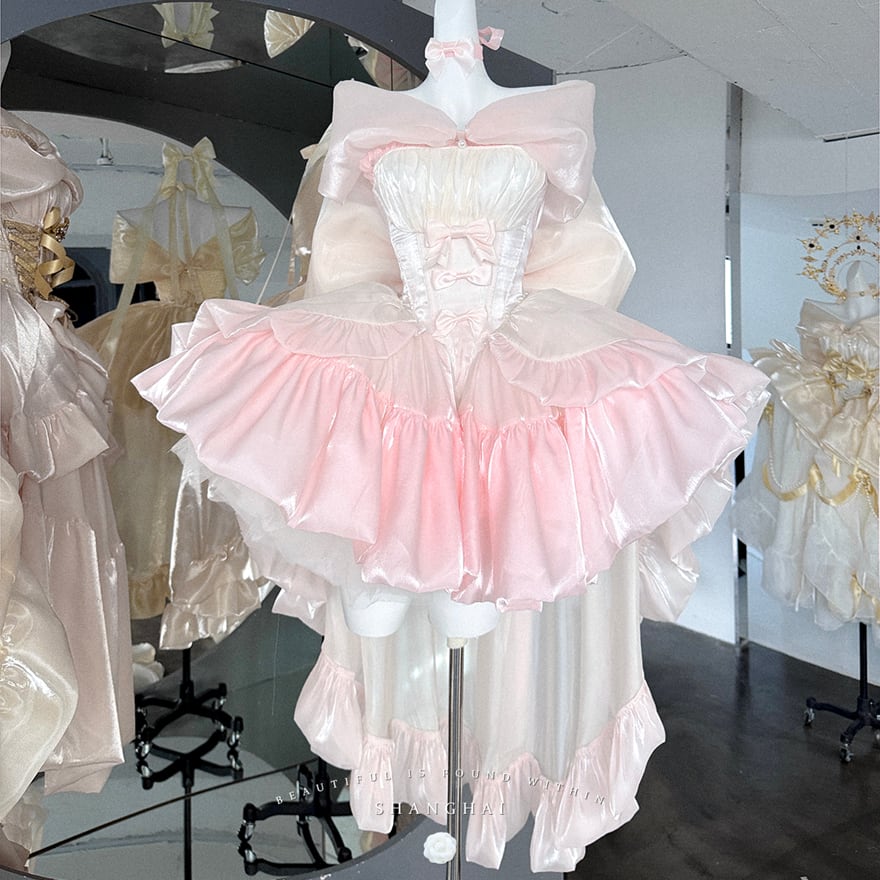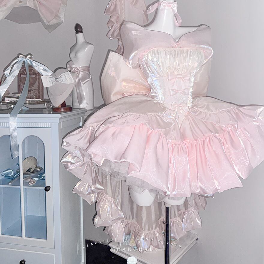 淡いピンクとホワイトのシフォン素材が幾重にも重なった、非常にボリュームのあるロリータドレスです。