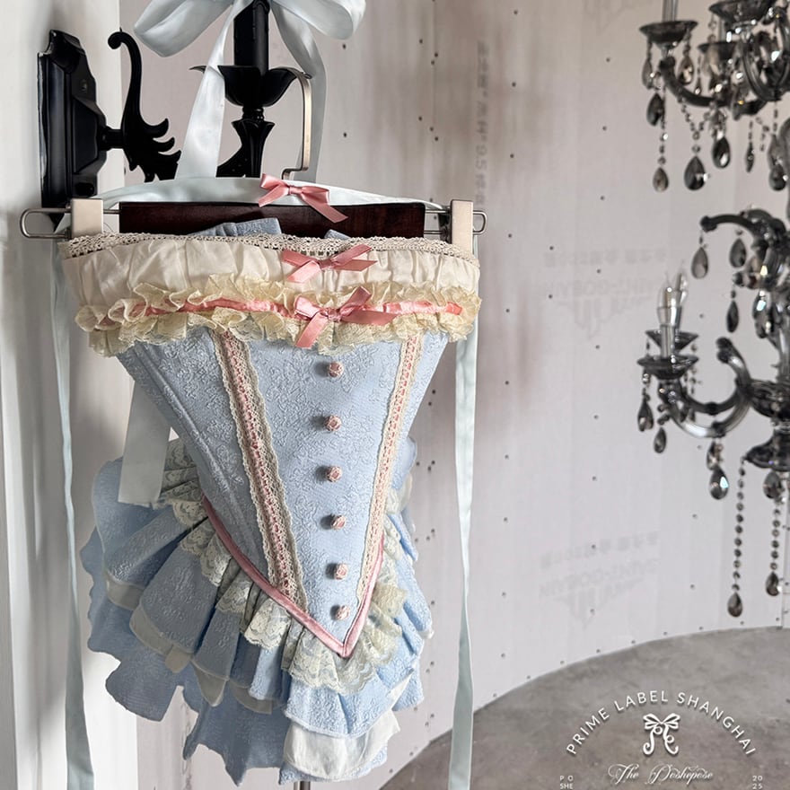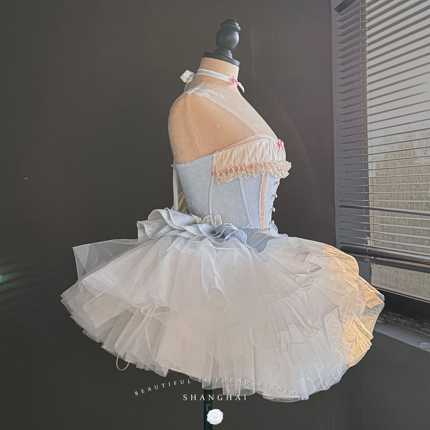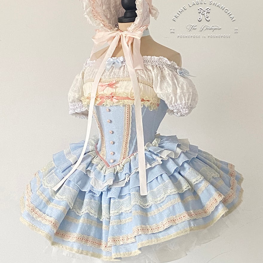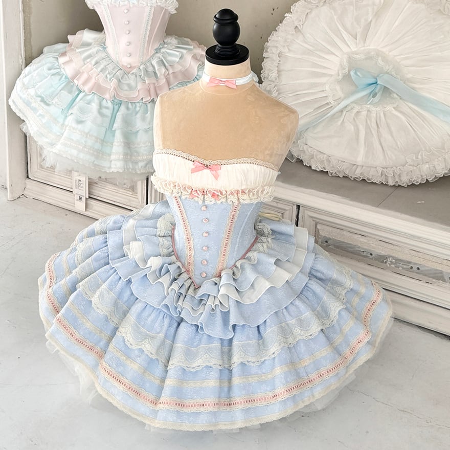 幾重にも重なるフリルと、ふんわりと広がるスカートのシルエット、そしてウエストの小さなリボンが、可愛らしくドーリーな印象を与えます。