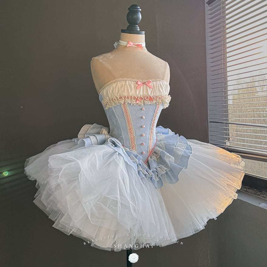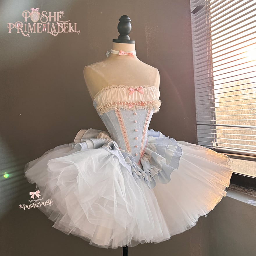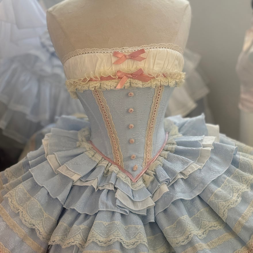 淡い空色の生地に、オフホワイトの繊細なレースとパステルピンクのラインが、胸元、スカートのフリルにあしらわれたロリータドレスです。