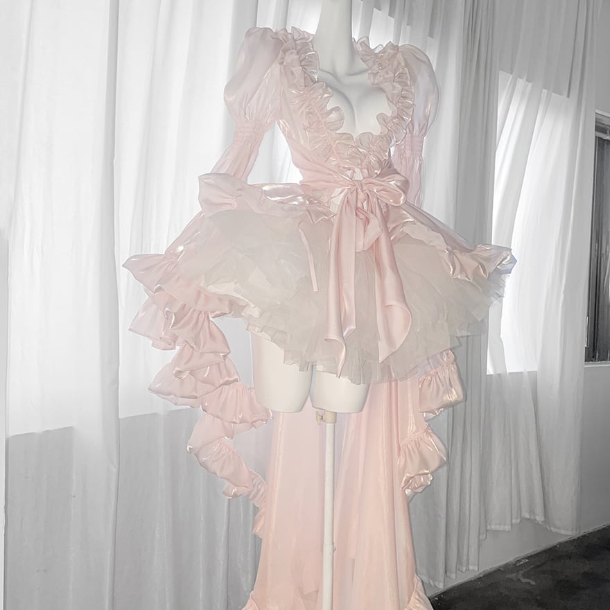 淡いベビーピンクの生地を基調に、オフホワイトのフリルとレースが贅沢にあしらわれた、アシンメトリーなロリータドレスです。