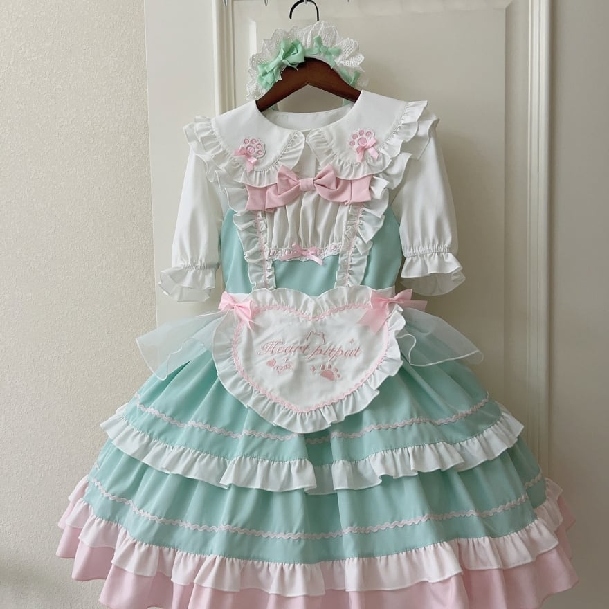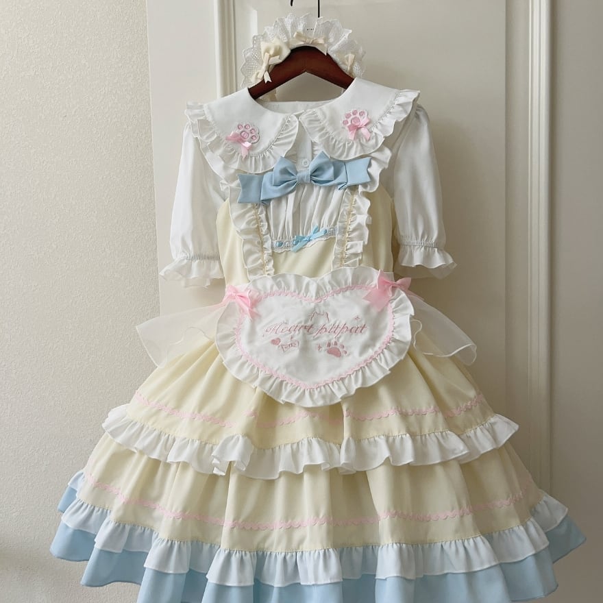 ロリィタ メイド服セットアップ(ブラウス、ジャンパースカート、エプロン、リボン、カチューシャ)