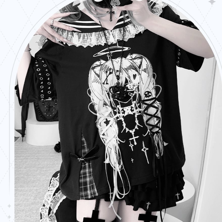 このシャツの魅力は、セーラー服の清潔感と、地雷系の退廃的な雰囲気が絶妙に調和している点にある。甘さとダークさが共存するデザインは、シンプルなボトムスと合わせるだけで、地雷系の世界観を確立させる。