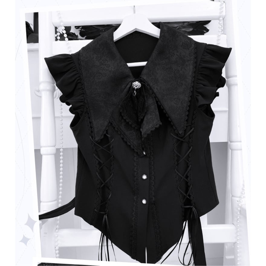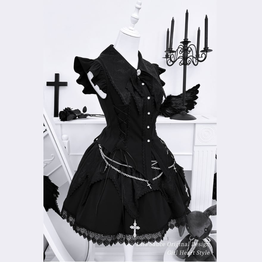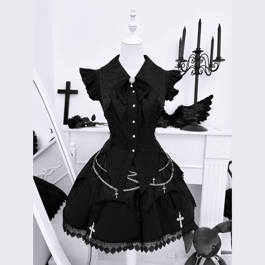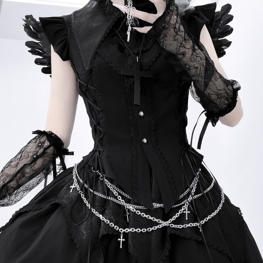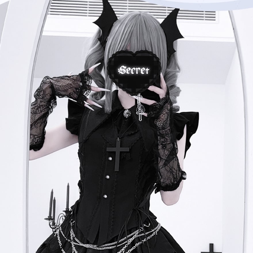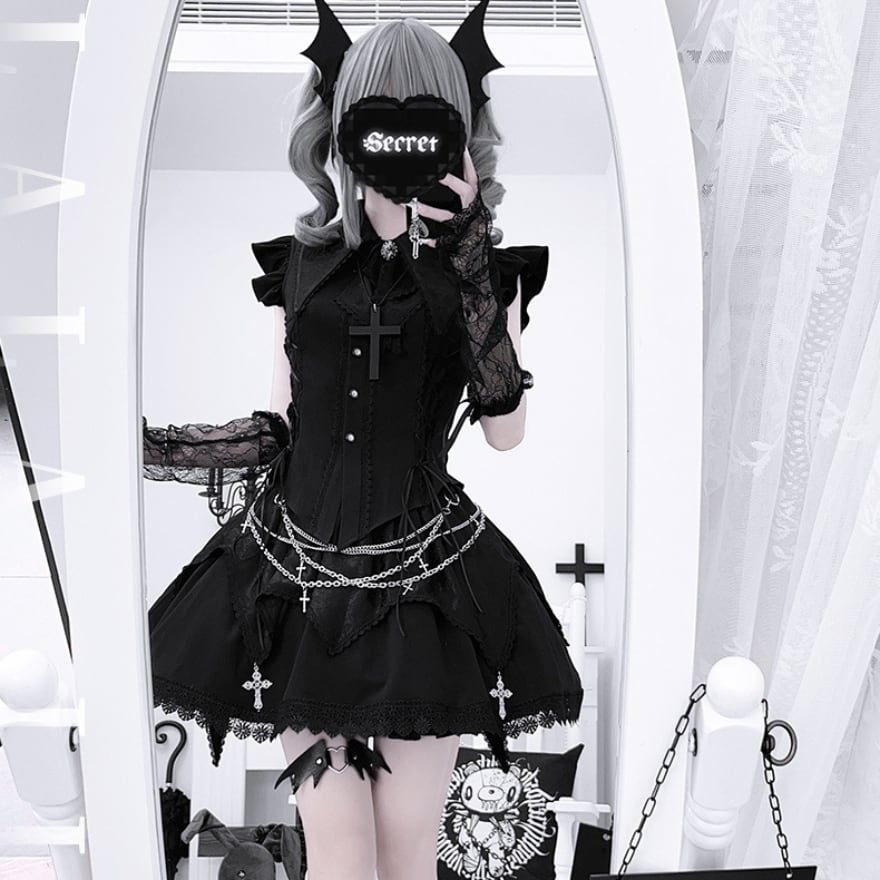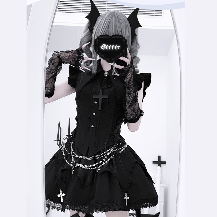 甘く危険な、私の秘密。地雷系とゴスロリの要素が融合した、甘辛MIXのセットアップ。繊細なレースとハードなストラップが織りなす、反骨的でいてドーリーな存在感が、あなたの推し活やライブを最高に特別な時間にする。