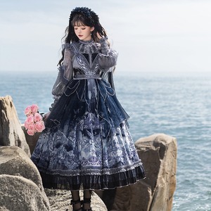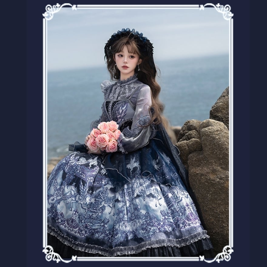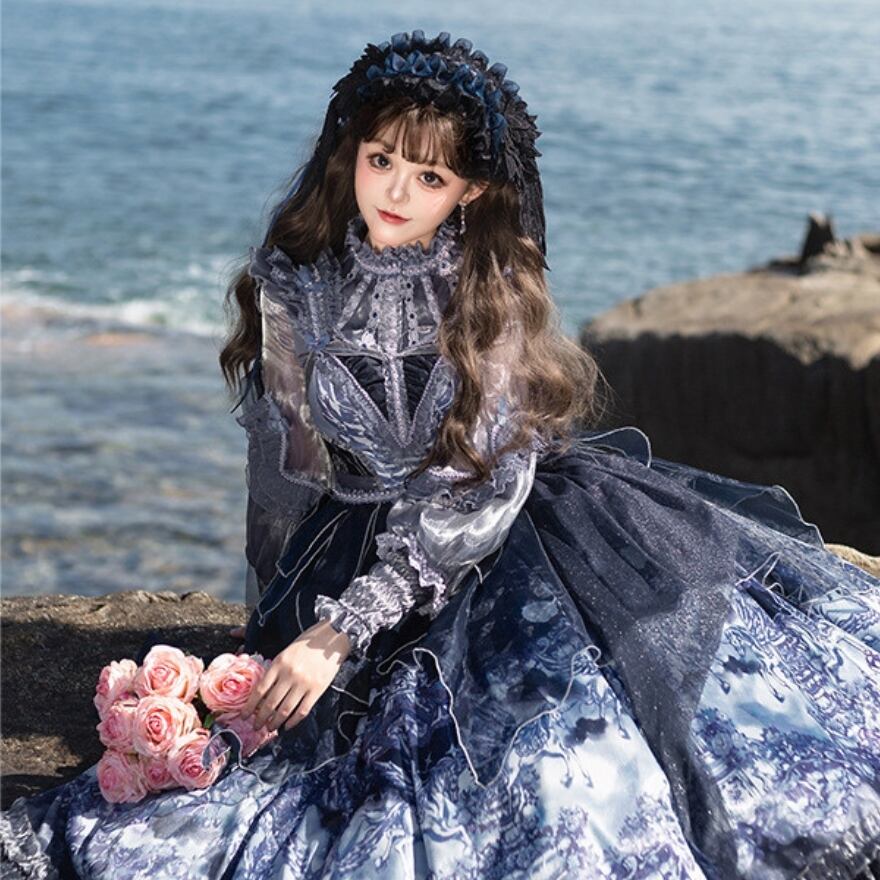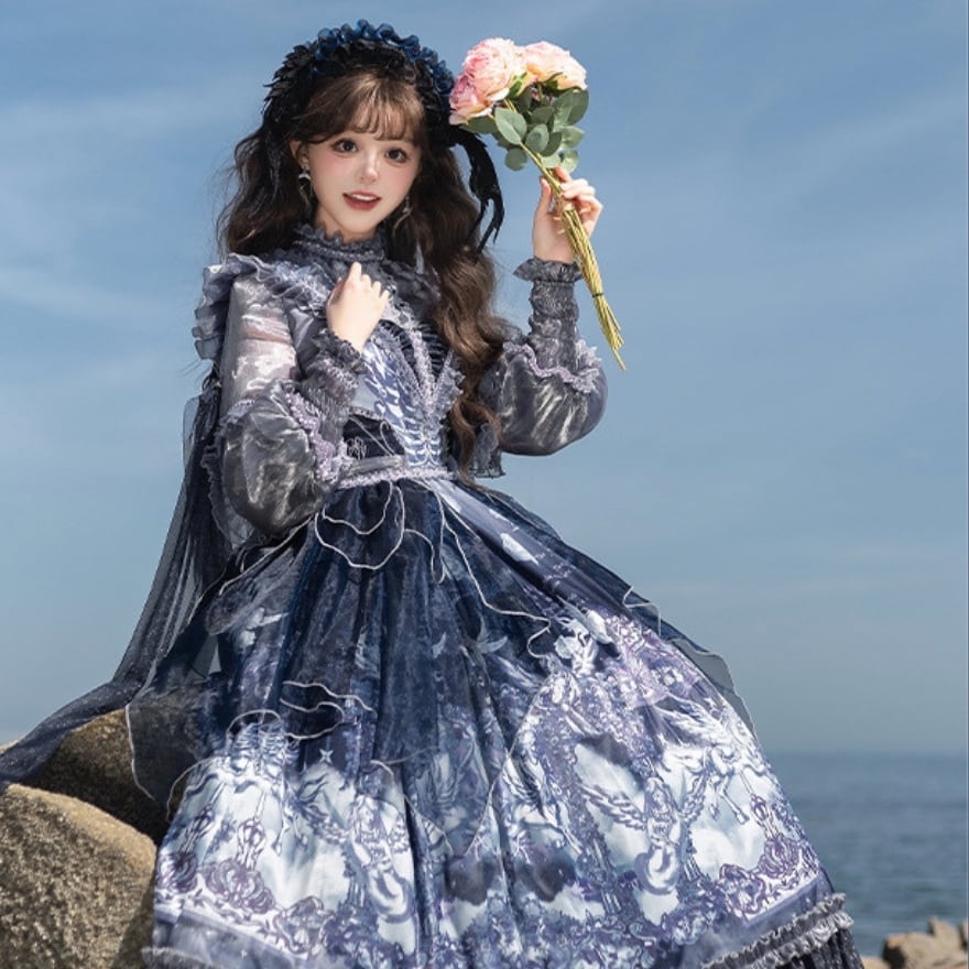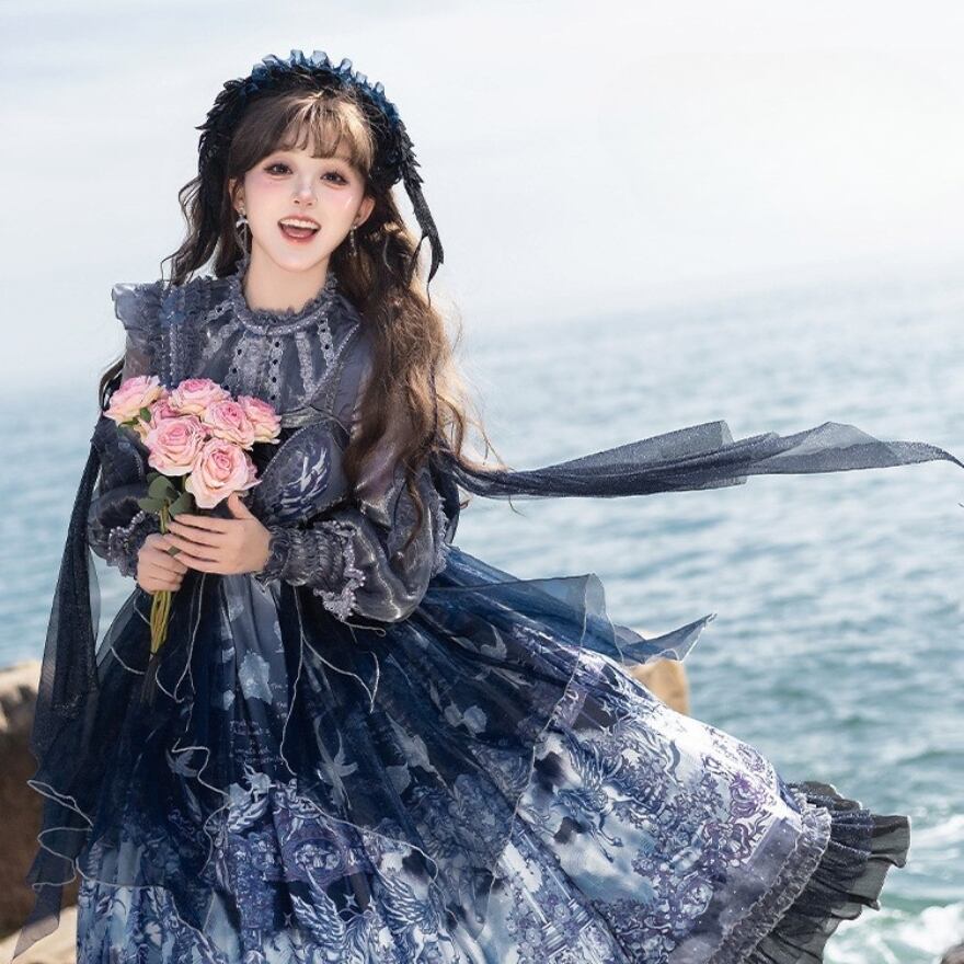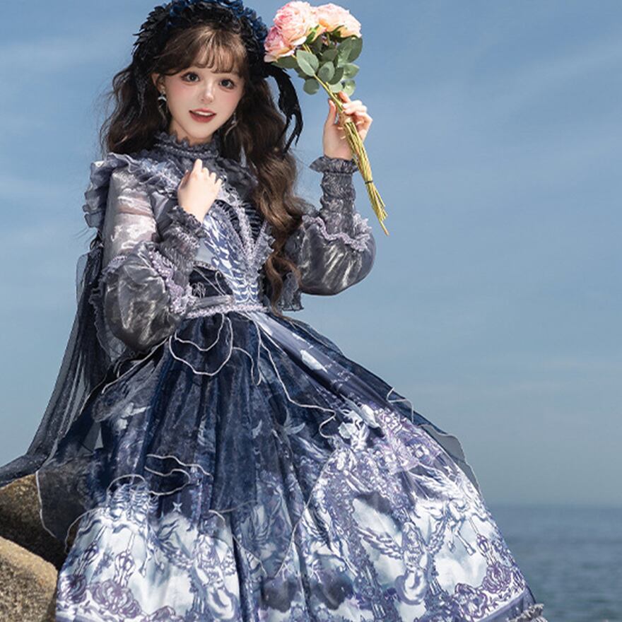深いネイビーとホワイトのグラデーションが美しい、クラシカルなロリータファッションのセットアップです。シースルーのブラウスと、繊細なプリントが施されたJSK(ジャンパースカート)、そしてその上に重ねるシフォンレイヤーが、幻想的でエレガントな雰囲気を醸し出しています。