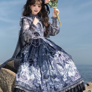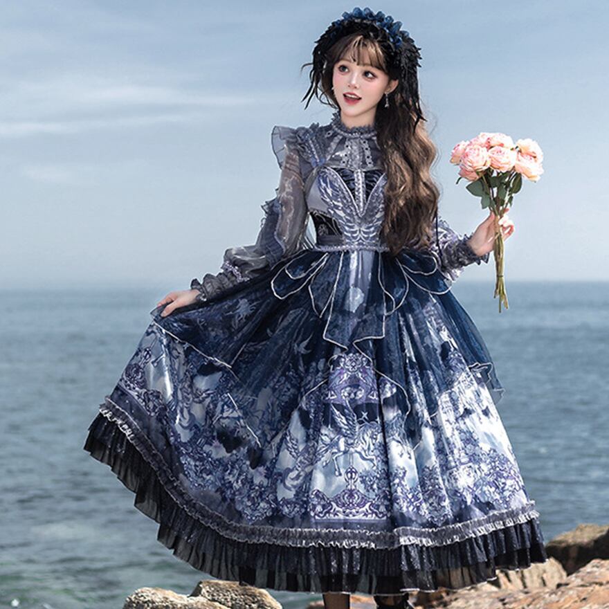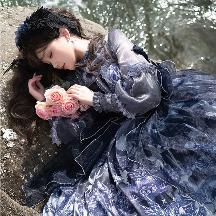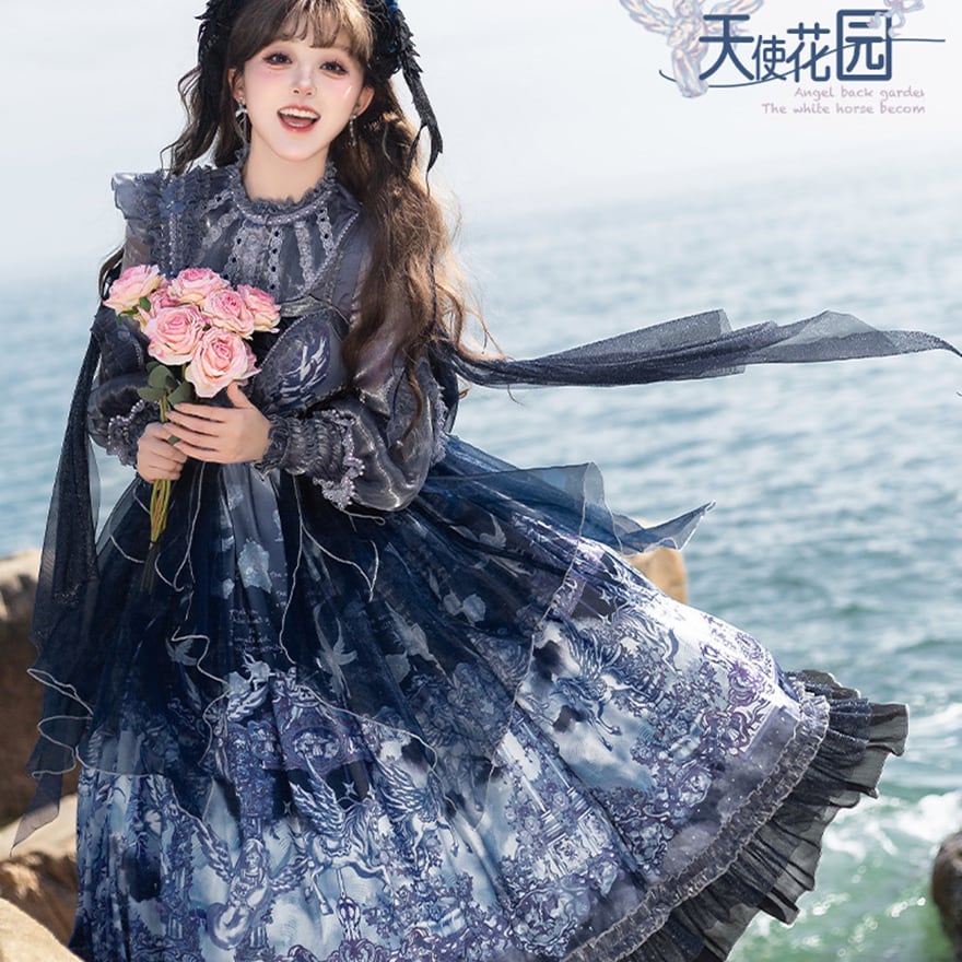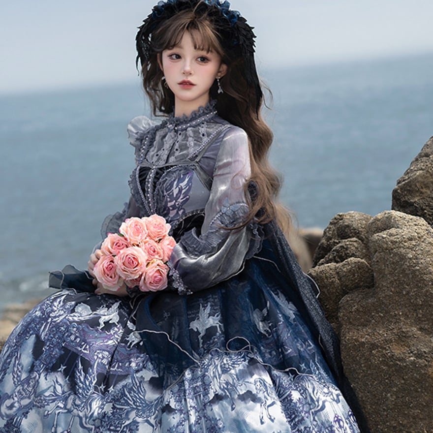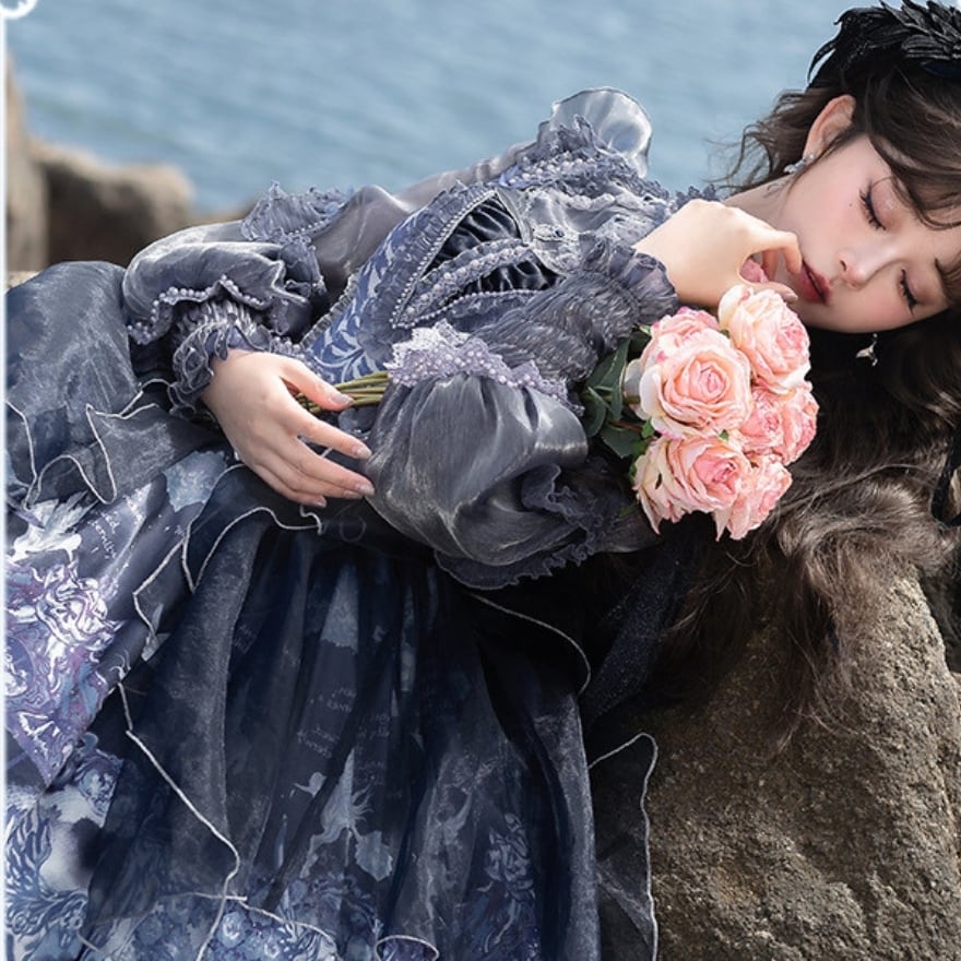 深いネイビーとホワイトのグラデーションが美しい、クラシカルなロリータファッションのセットアップです。シースルーのブラウスと、繊細なプリントが施されたJSK(ジャンパースカート)、そしてその上に重ねるシフォンレイヤーが、幻想的でエレガントな雰囲気を醸し出しています。