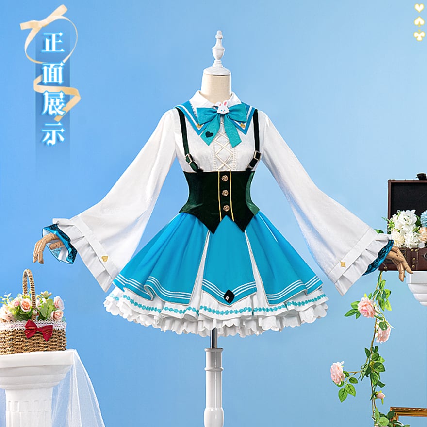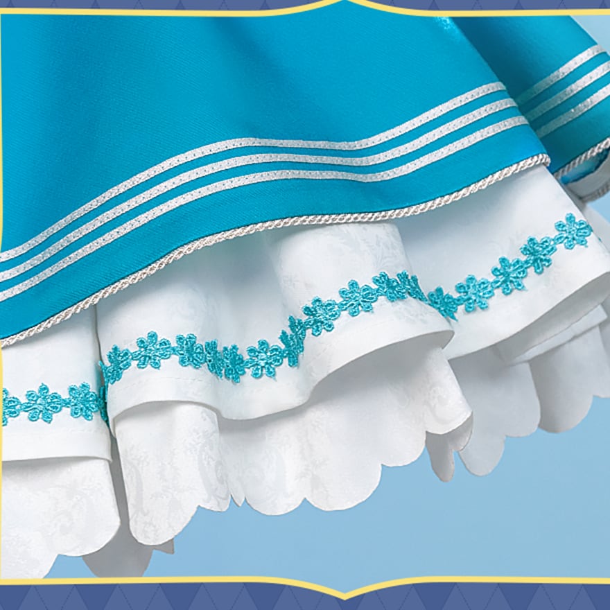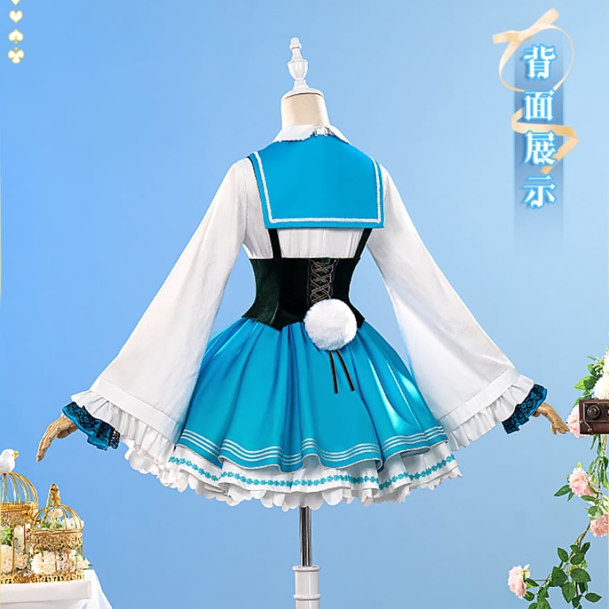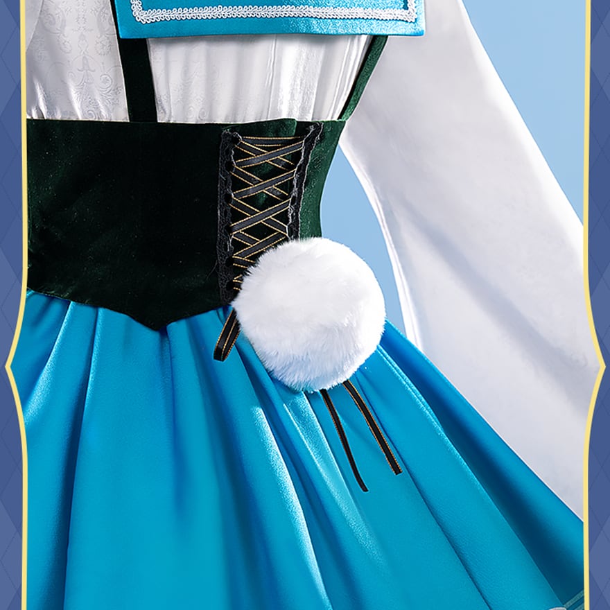 白と鮮やかなターコイズブルーを基調とした、可愛らしいコスプレ衣装です。セーラーカラーのブラウスに、コルセット風の黒いビスチェ、そしてボリュームのあるフリルスカートがセットになっています。