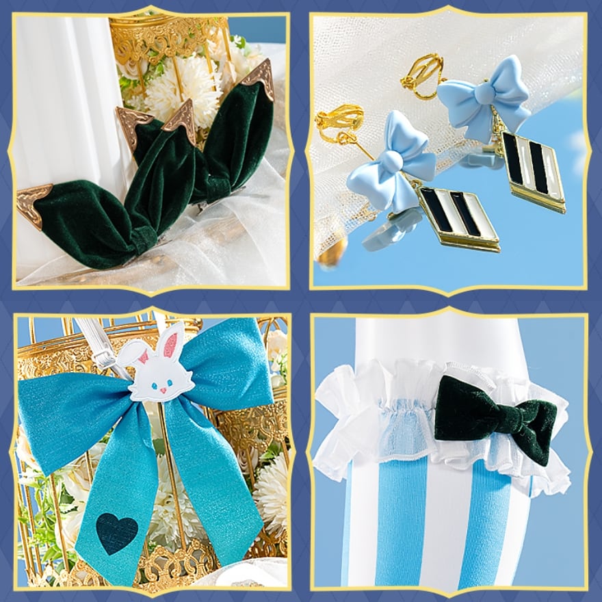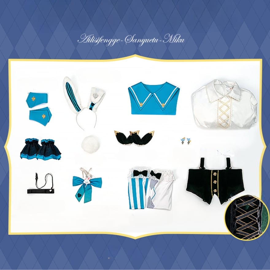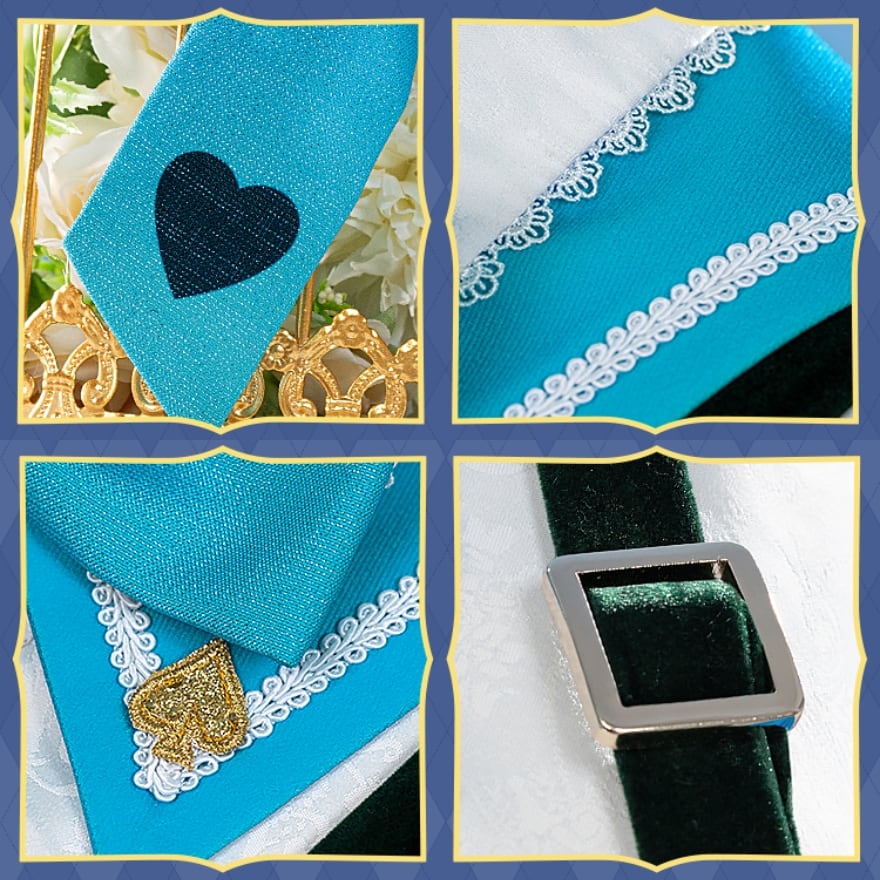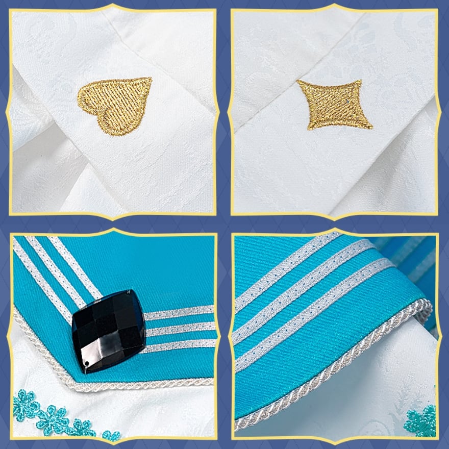 白と鮮やかなターコイズブルーを基調とした、可愛らしいコスプレ衣装です。セーラーカラーのブラウスに、コルセット風の黒いビスチェ、そしてボリュームのあるフリルスカートがセットになっています。
