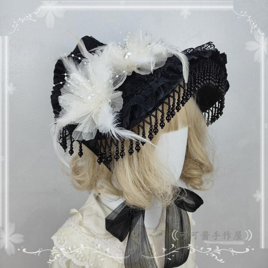 闇夜に咲き誇る、黒百合のロマン。ヴィンテージ感漂うゴシックなボンネットが、あなたのミステリアスな魅力を最大限に引き立てる。フェザーとレースが織りなす、退廃的で美しい存在感が、見る者の心を深く捉える。