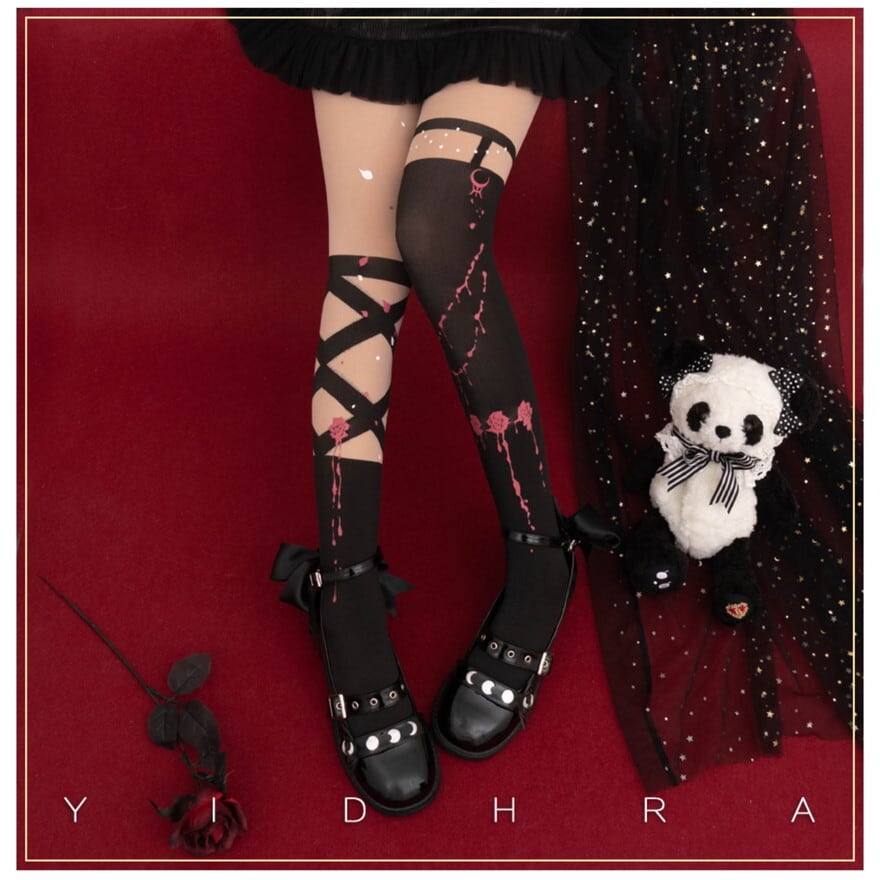 このタイツの魅力は、その左右非対称のデザインと、甘さとダークさが共存する世界観にあります。これ一つで、ハロウィンのコーディネートが一気に華やぎ、あなたの個性を強く印象付けます。
