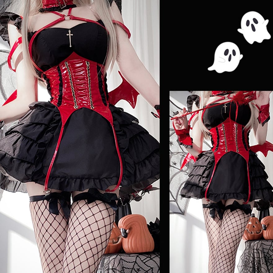 光沢感のある素材と、ふんわりとしたスカートを組み合わせたデビルコスプレ衣装です。