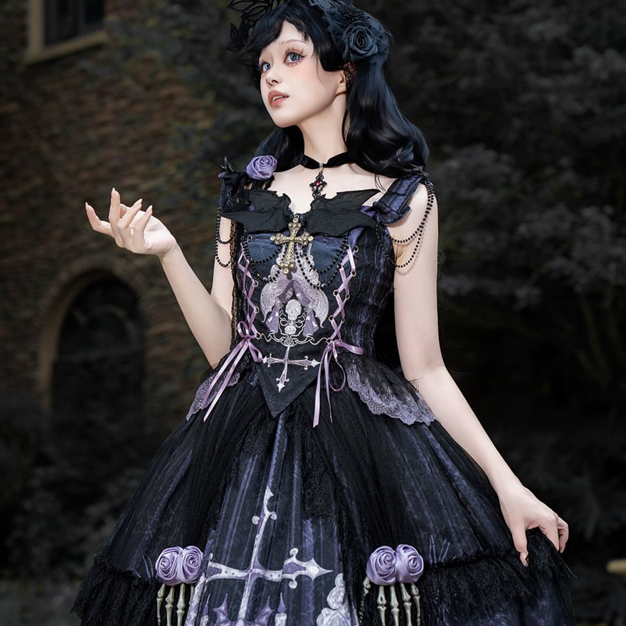 トップスは、十字架や鎖、骸骨の手などのモチーフが施され、スカートには墓地やコウモリ、蜘蛛の巣などが繊細なプリントで表現されています。