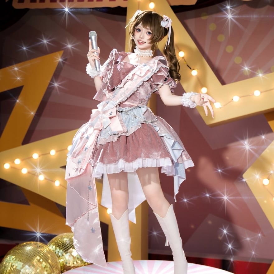 本商品は、アイドル衣装・ライブ/ステージ衣装として複数人分の購入ニーズがある、キラキラ仕様のフルセットワンピースです。タスキ(サッシュ)や大きなリボン、アクセサリーまで揃っており、これ1つで“デビュー衣装/生誕祭/イベント衣装”が完成。グループ衣装としての統一感も作りやすく、まとめ買い・追加発注のご相談にも対応しています。使用日が決まっている場合は、事前の納期確認をおすすめします。