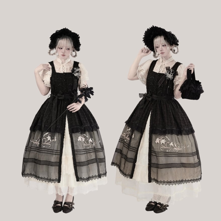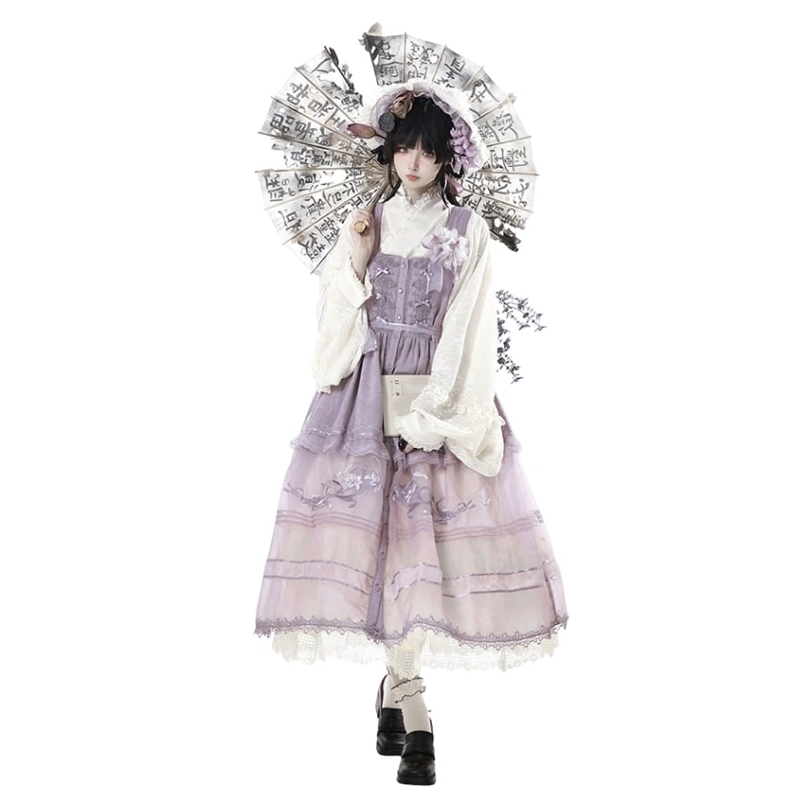 東洋の華やかさと、西洋の可憐さが溶け合う、幻想的なジャンパースカート。着物風のデザインと繊細な花柄が、あなたのスタイルを雅に彩る。
