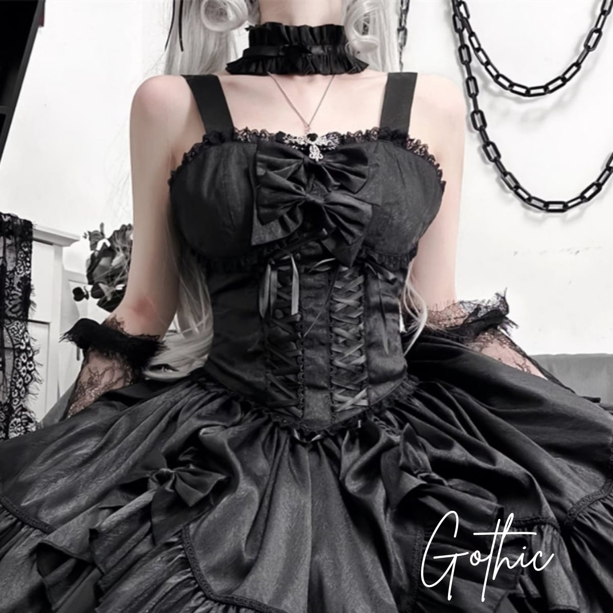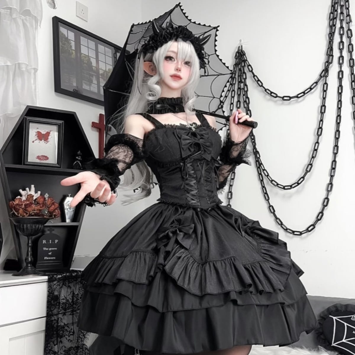 甘さと毒が溶け合う、闇のプリンセス。揺れるフリルとクールなストラップが、あなたの魅力を引き出す一着。