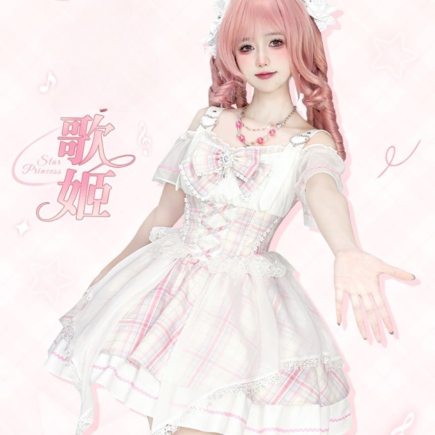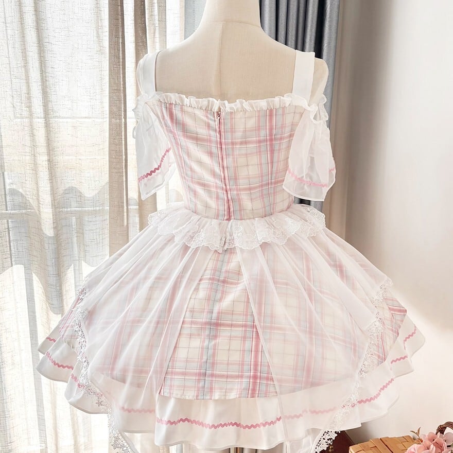 淡いピンクと水色のチェック柄の生地に、オフホワイトの繊細なレースが胸元、肩、裾にあしらわれた、甘ロリのジャンパースカートです。