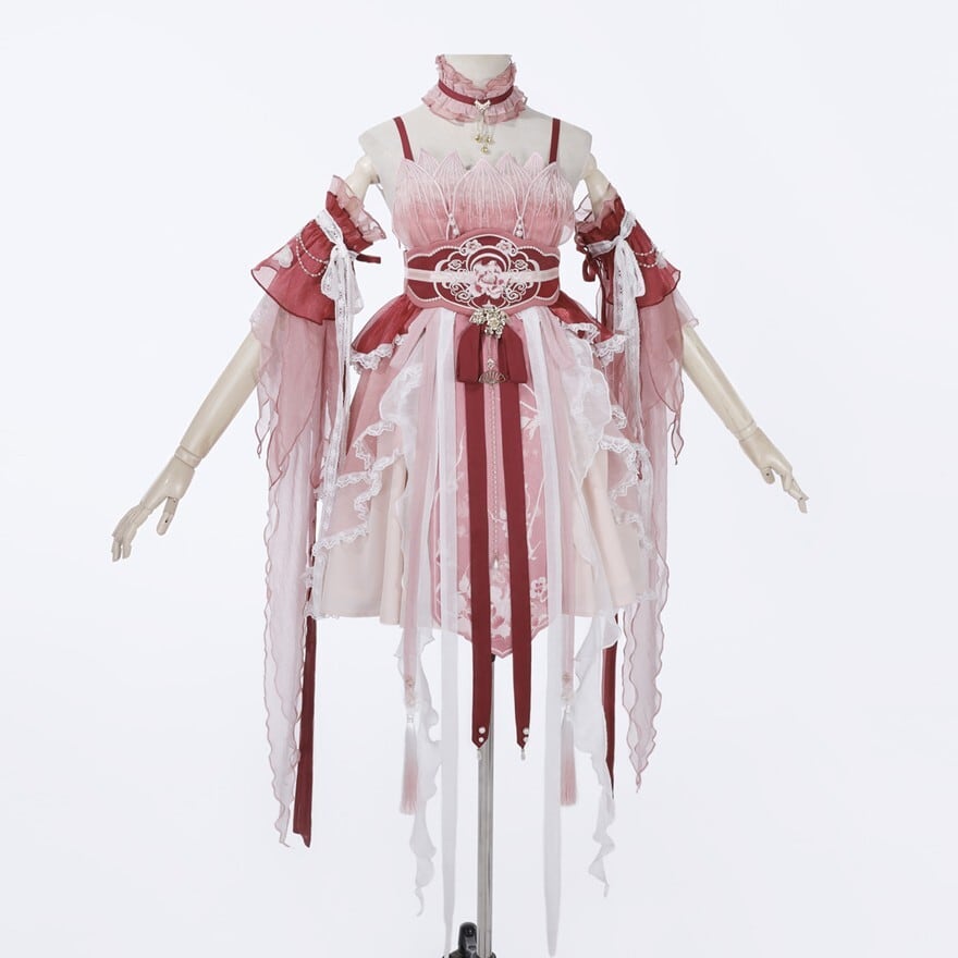 淡いピンクと深いワインレッドの生地に、繊細なレースやフリル、タッセルがあしらわれた、中華ロリィタのセットアップです。