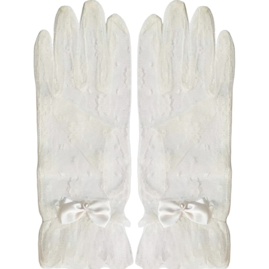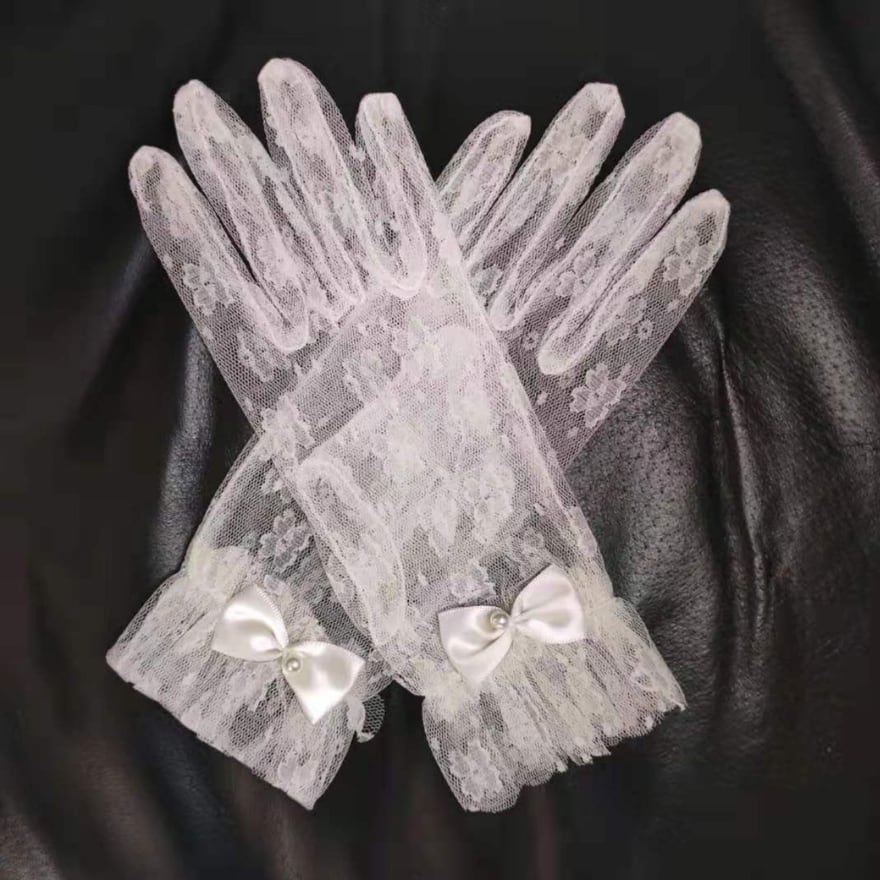 繊細な透け感が美しい総レース仕立てで、エレガントな柄が手元を優雅に彩ります。手首には、小さなサテンリボンと上品なパールがあしらわれ、ふんわりとしたフリルが可憐な印象を際立たせます。つけるだけで、まるで物語から飛び出してきたような、清楚で夢見るような雰囲気をプラスしてくれる魔法のアイテムです。