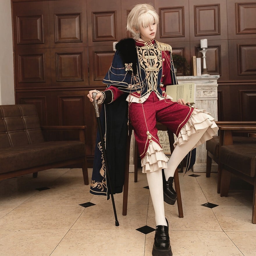 鮮やかな赤と紺の生地に、ゴールドの刺繍や飾緒が施された、王子ロリータのセットアップです。