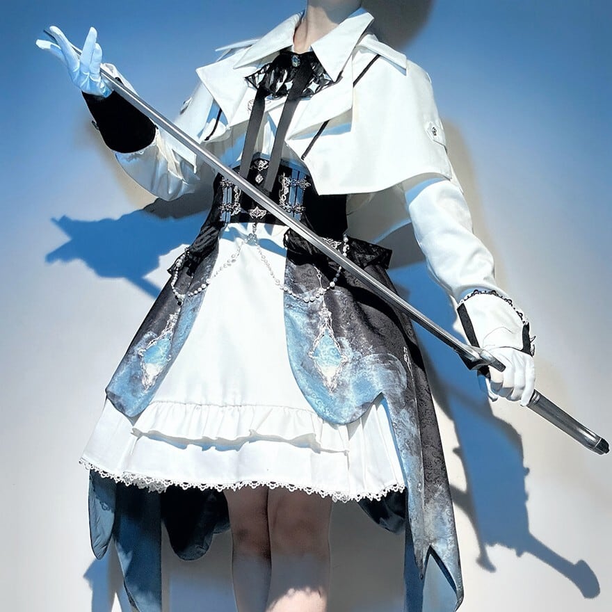 ホワイトの生地をベースに、ネイビーとグラデーションの柄がプリントされた、皇子系ロリータのセットアップです。