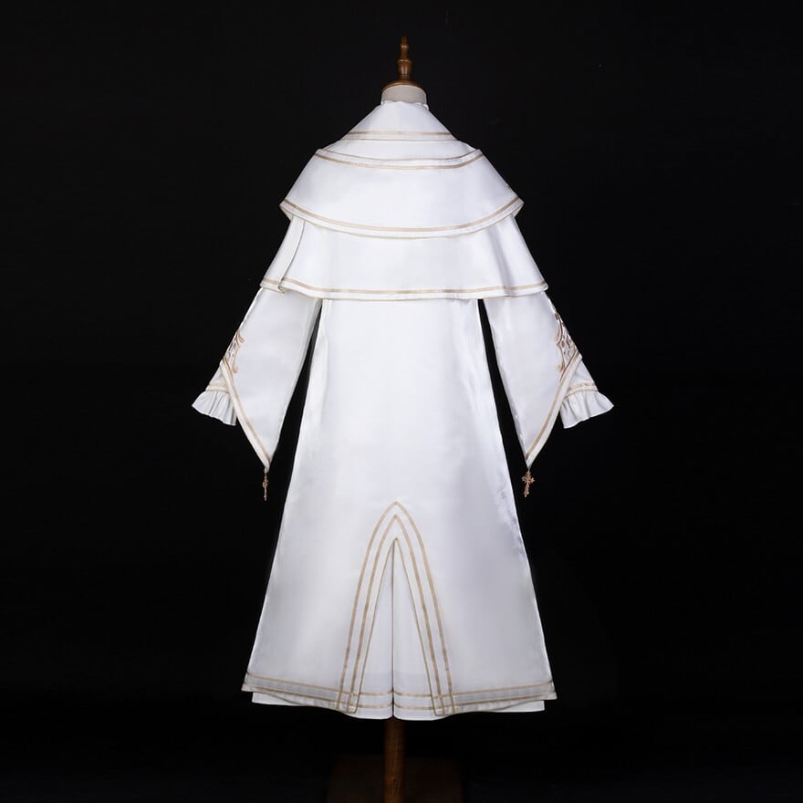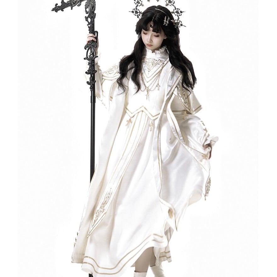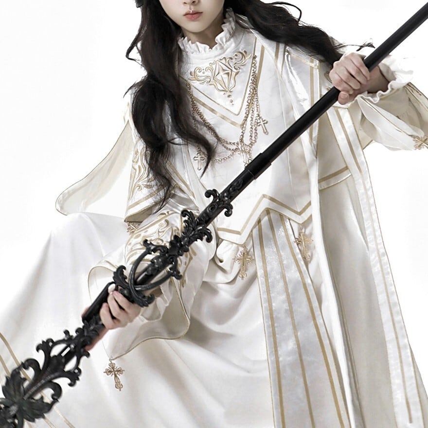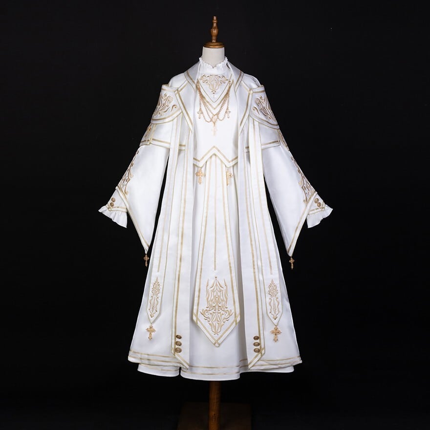 十字架や繊細な模様の刺繍が、荘厳で神聖な雰囲気を醸し出し、威厳のあるスタイルを演出します。