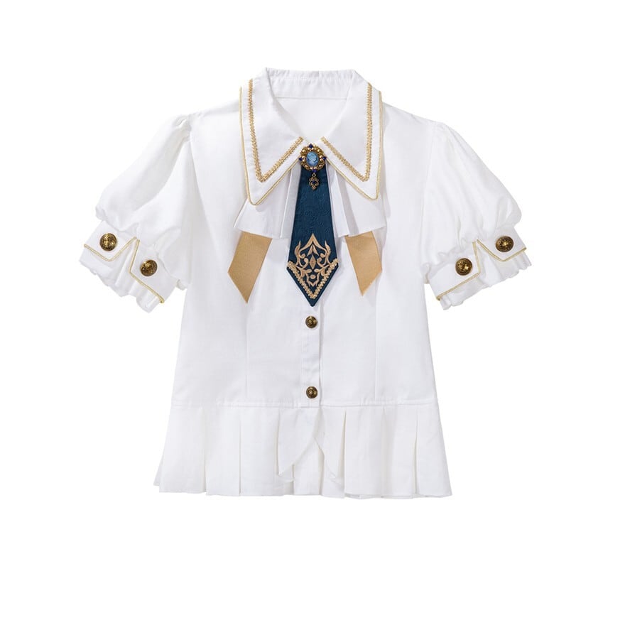 パフスリーブのシャツとショートパンツ、そして優雅なデザインのジャケットの3点セットで、気品と可愛らしさが共存するデザインが特徴。