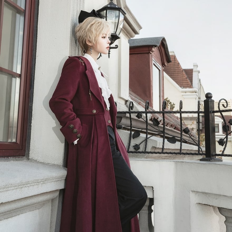 コート: ベルベットのような光沢のある生地を使用した、重厚感のあるコート。袖口のフリルと、金ボタンが、クラシカルで豪華な雰囲気を演出します。
