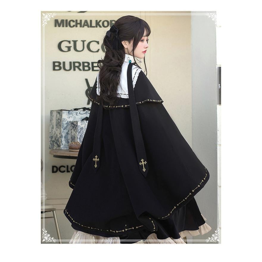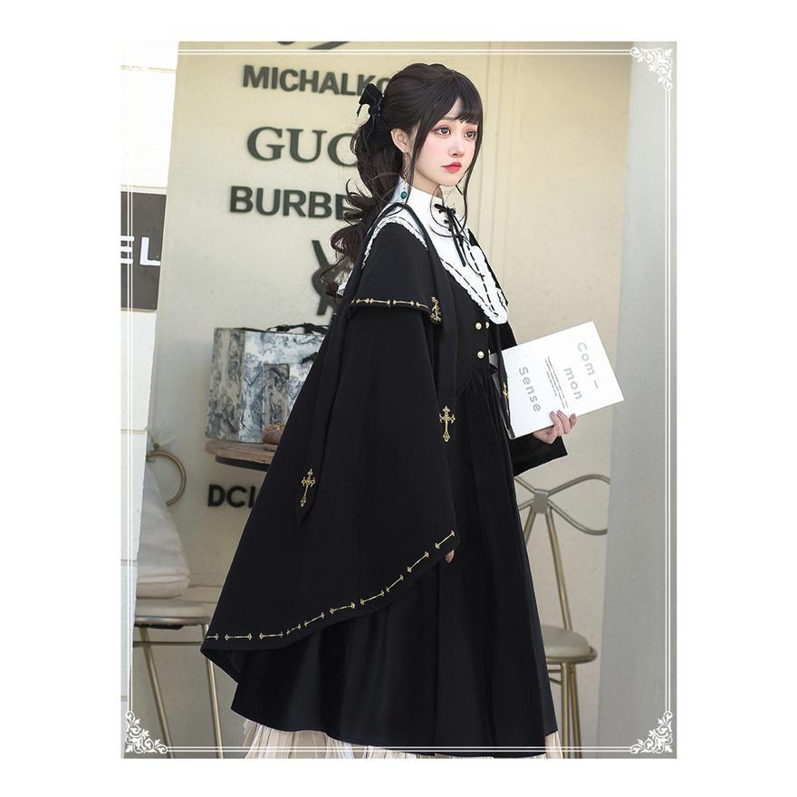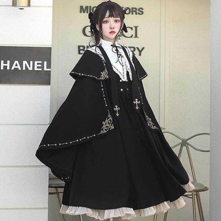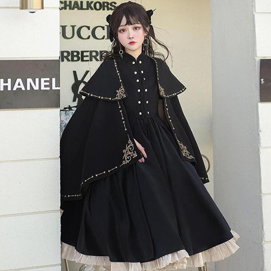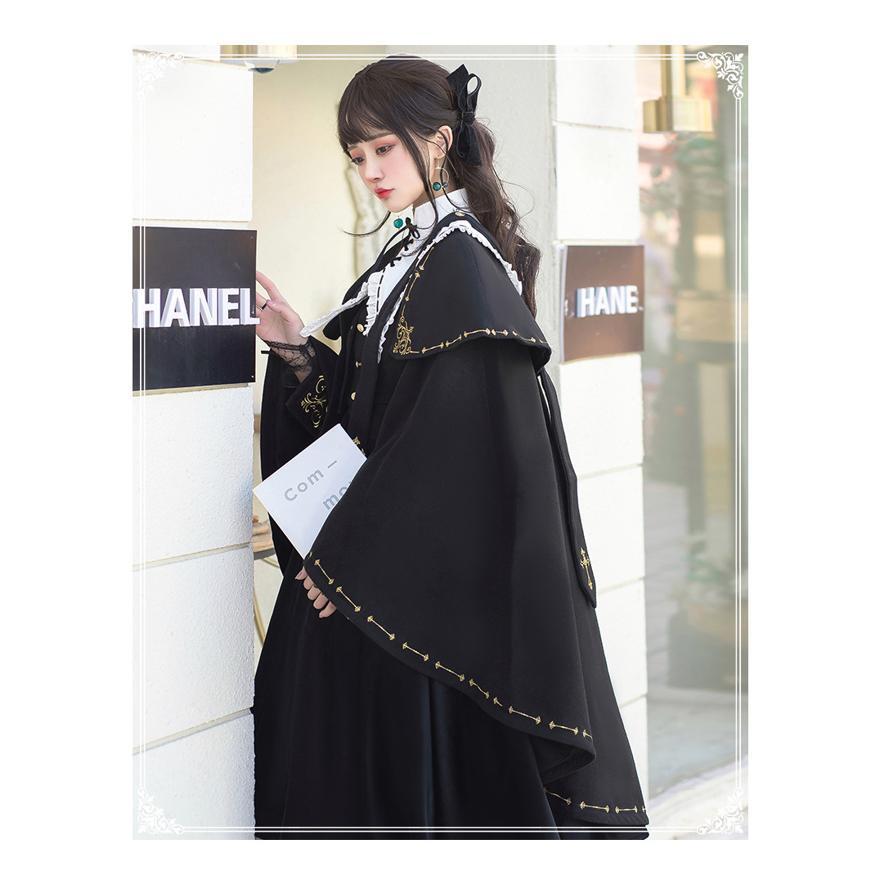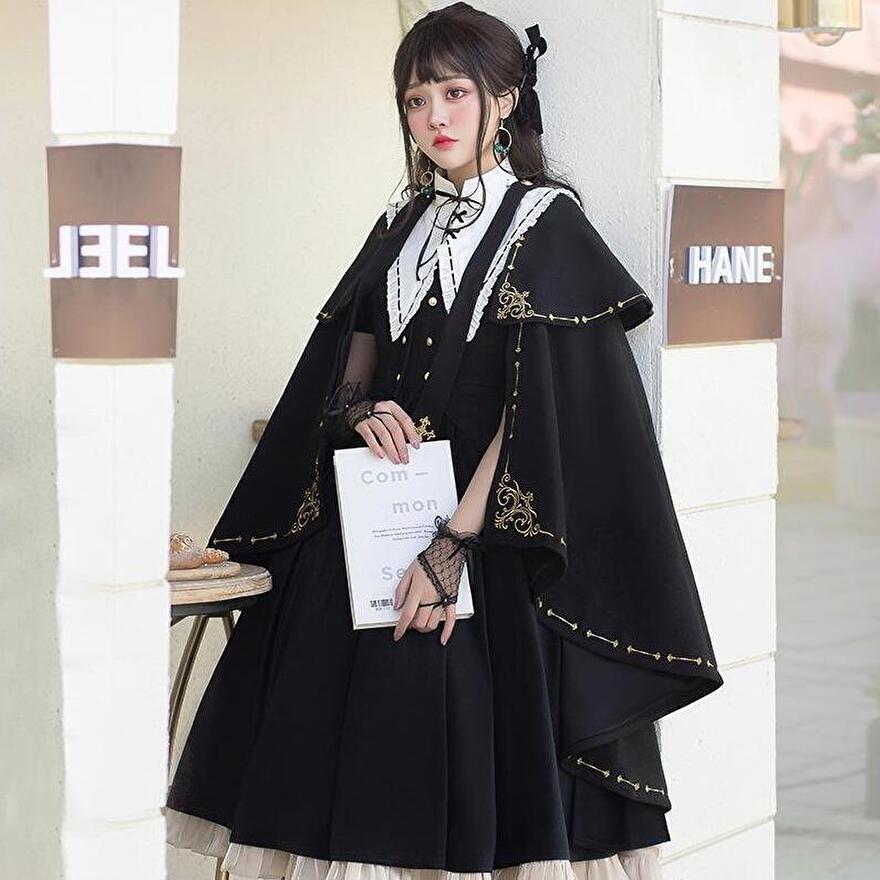 甘さのあるつけ襟に、黒地にゴールドの刺繍が輝く魔法使いのようなマントがゴスロリの世界観にもマッチ。