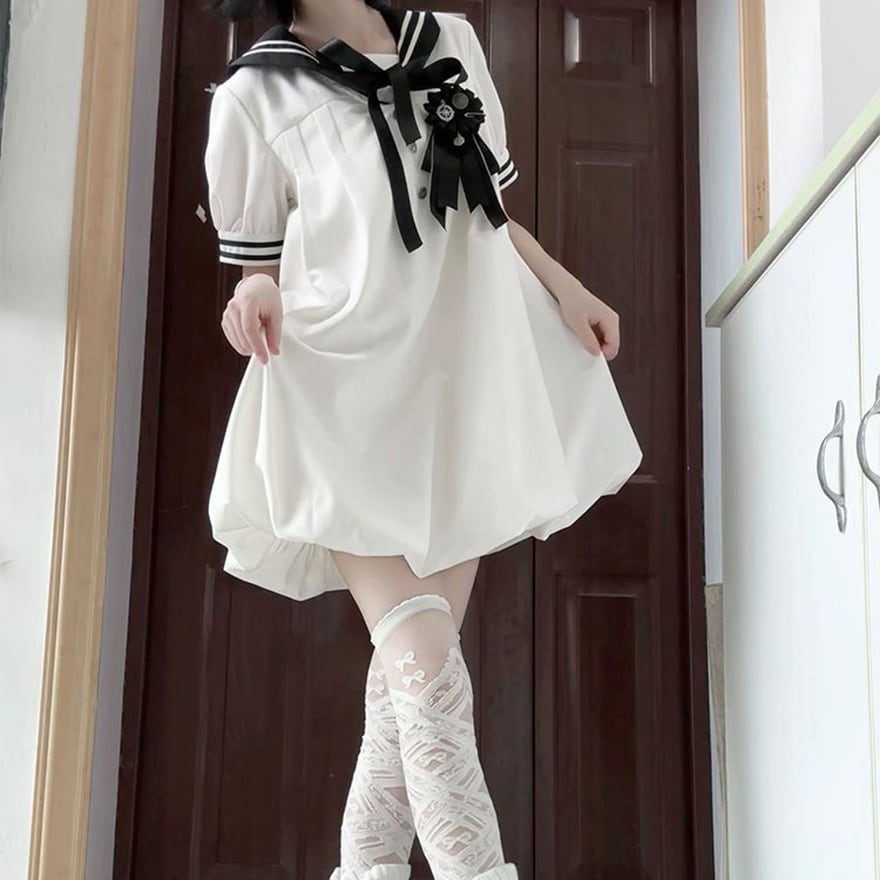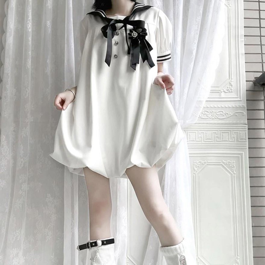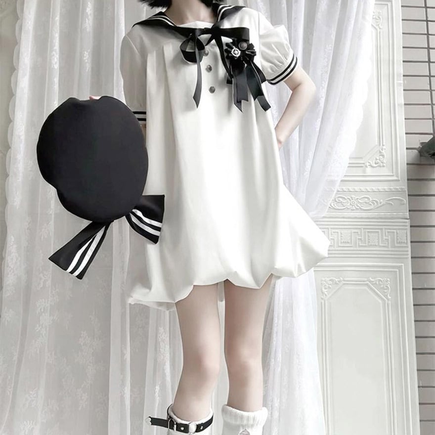 胸元の大きな黒いリボンと、袖口のラインがデザインのアクセント。モノトーン配色で、甘さの中にクールな雰囲気をプラスしています。
