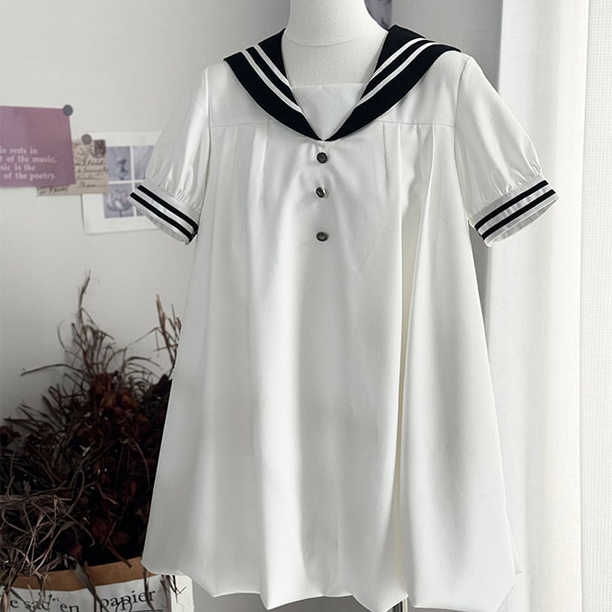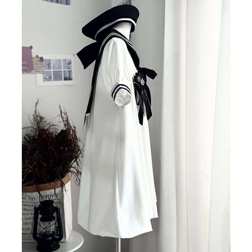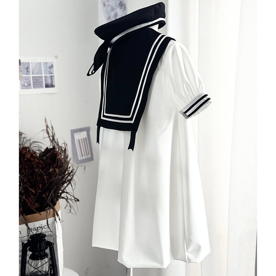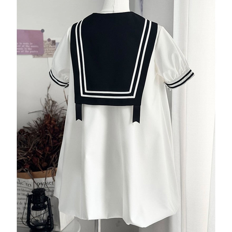 ホワイトの生地に、ブラックのセーラーカラーが映える、少年装スタイルのワンピースです。