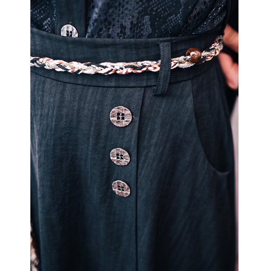 ウエスト部分にあしらわれた装飾的なボタンが、全体のデザインを引き締めるアクセントになっています。