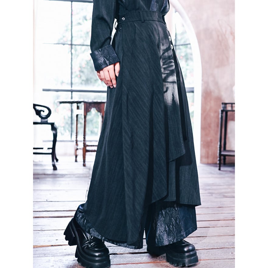 一見するとアシンメトリーなロングスカート、しかしその内側にはクールな蛇柄のワイドパンツが隠された、独創的なデザインの袴パンツです。