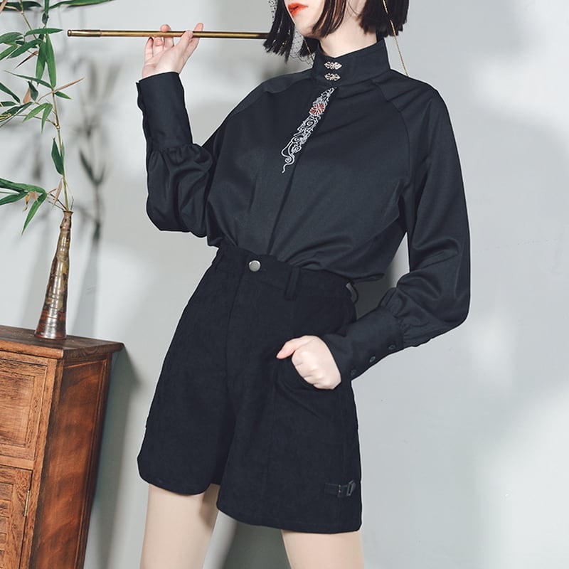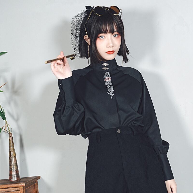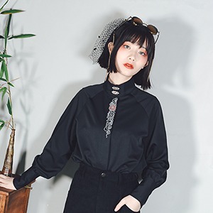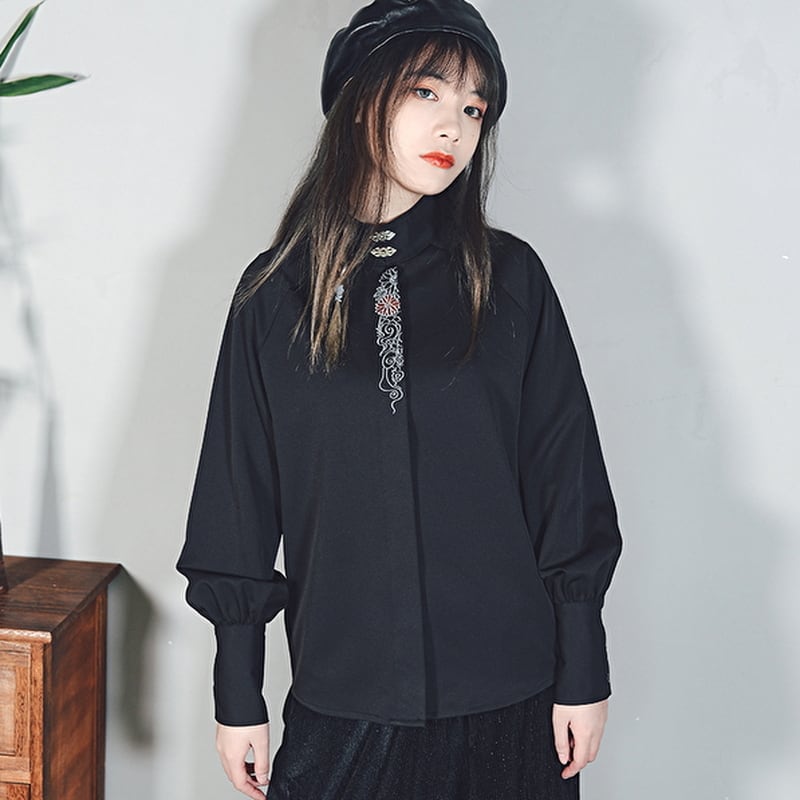 チャイナ風デザインに胸元に縫製されたレトロな刺繍が病み可愛い秋冬に着まわしたい地雷系シャツです。