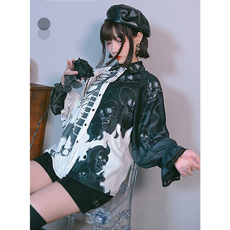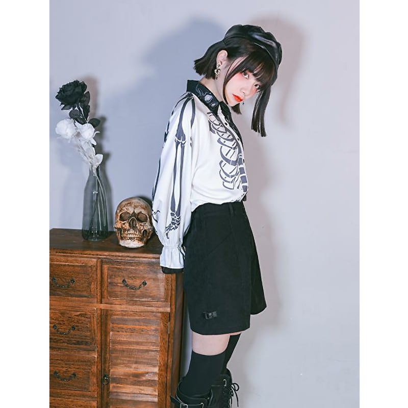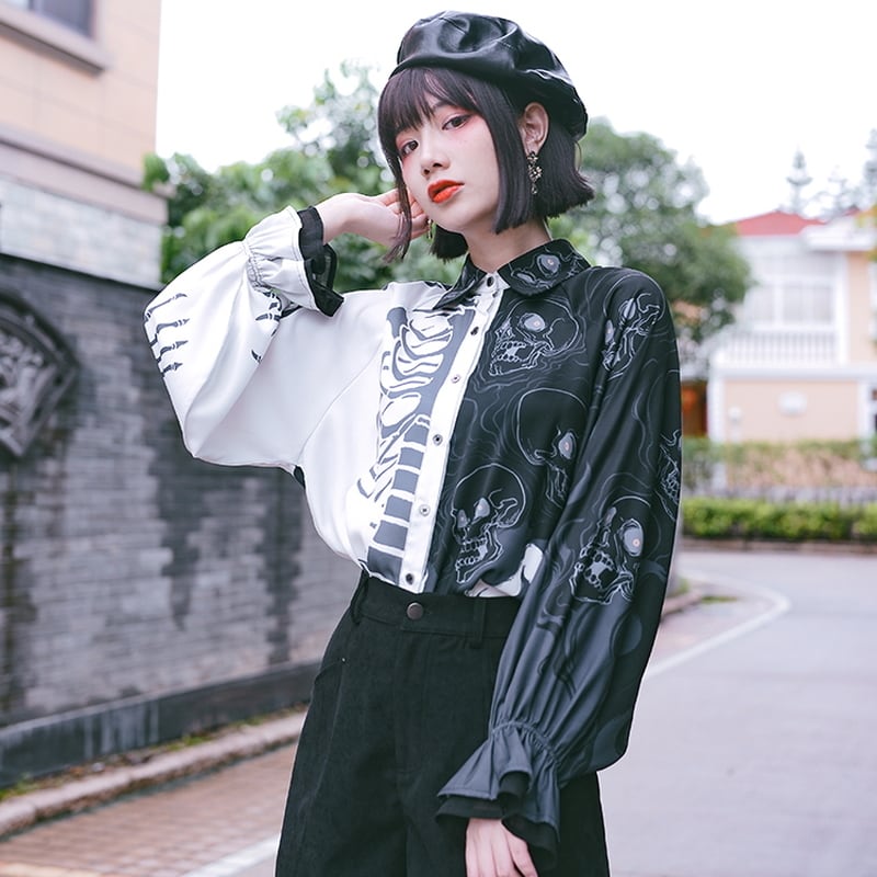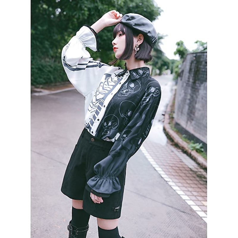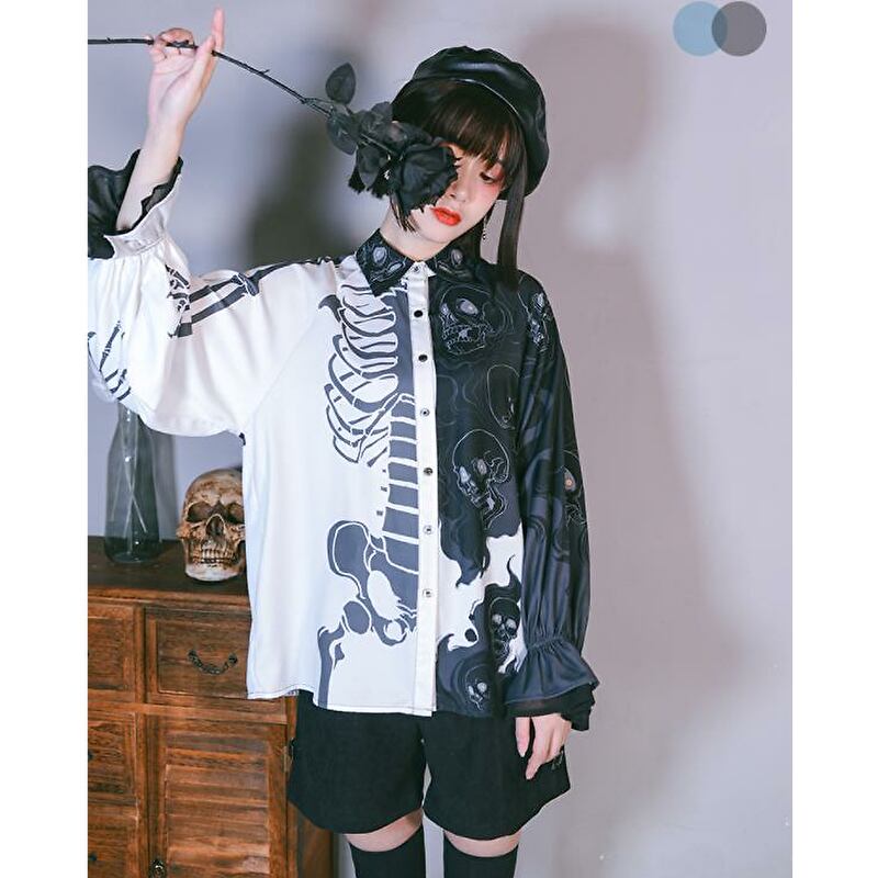 左右で異なるスカルプリント柄にスリーブは甘いランタンスリーブがおしゃれかわいい