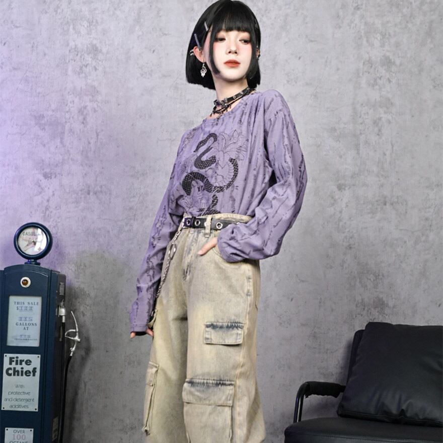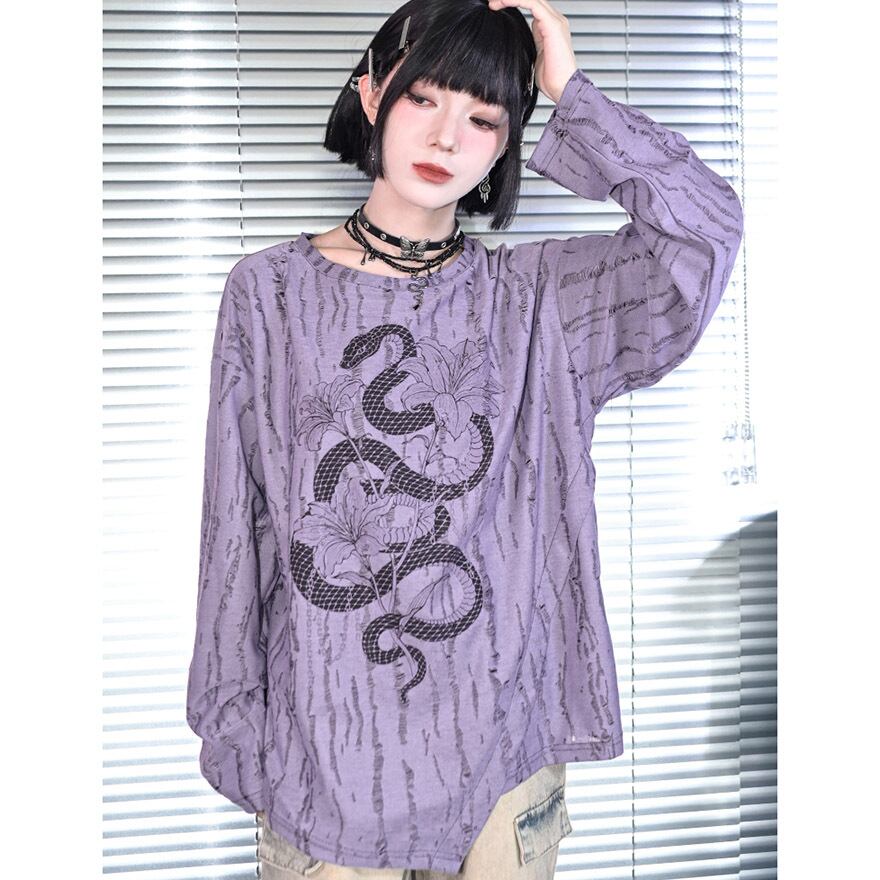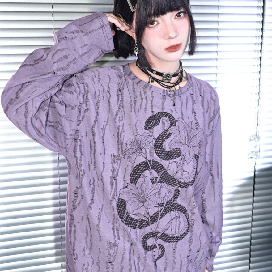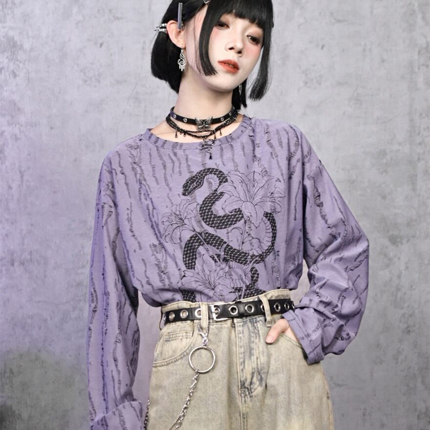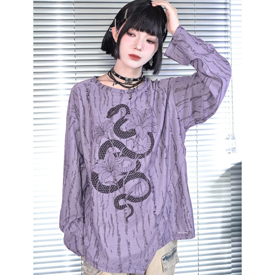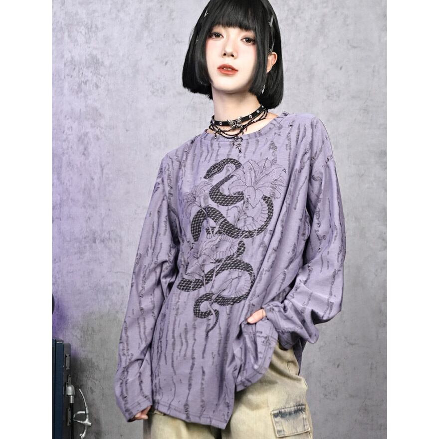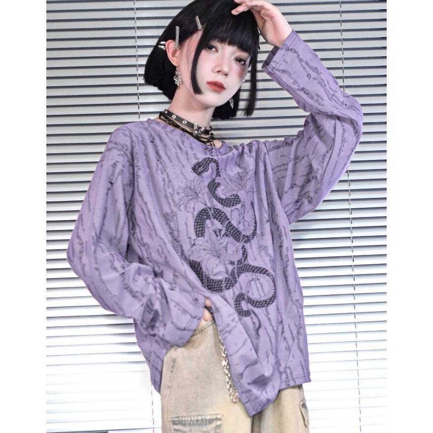 関連キーワード: #チャイナ #中華風 #サブカル #ストリート #グランジ #地雷系 #ロンT #長袖Tシャツ #蛇 #スネーク #プリントTシャツ #ダメージ加工 #オーバーサイズ #ユニセックス #パープル #ラベンダー #参戦服 #Y2K