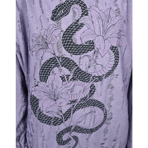 くすんだラベンダーカラーの生地に、百合の花と絡みつく蛇のグラフィックが大きくプリントされた長袖Tシャツです。
