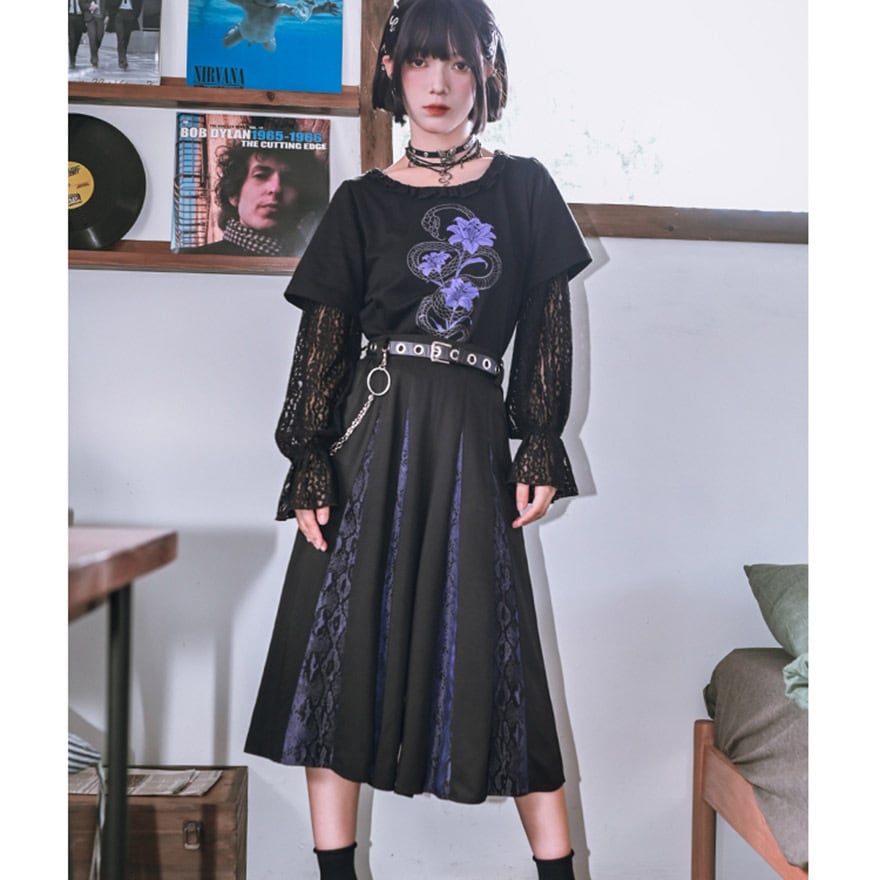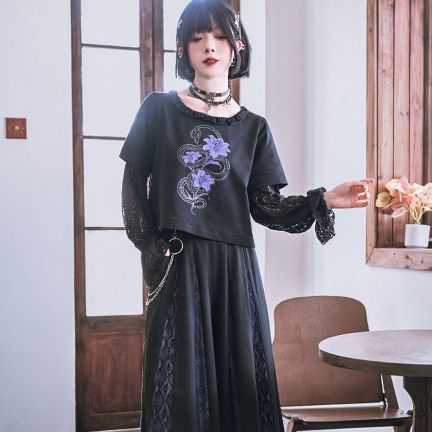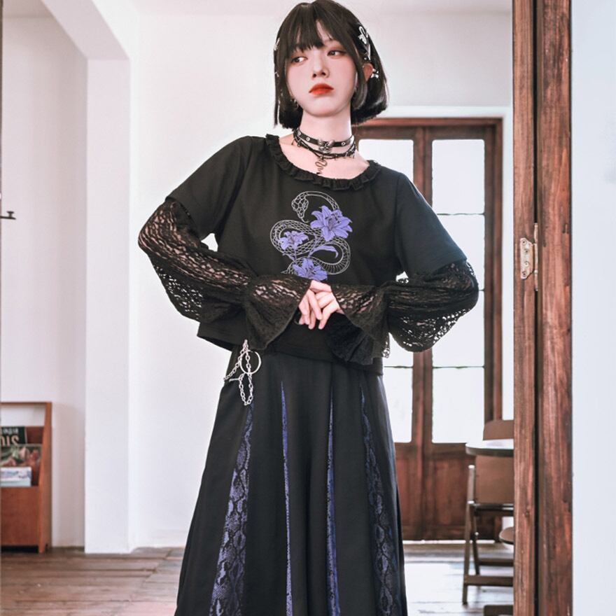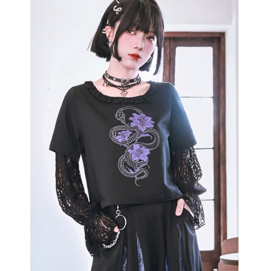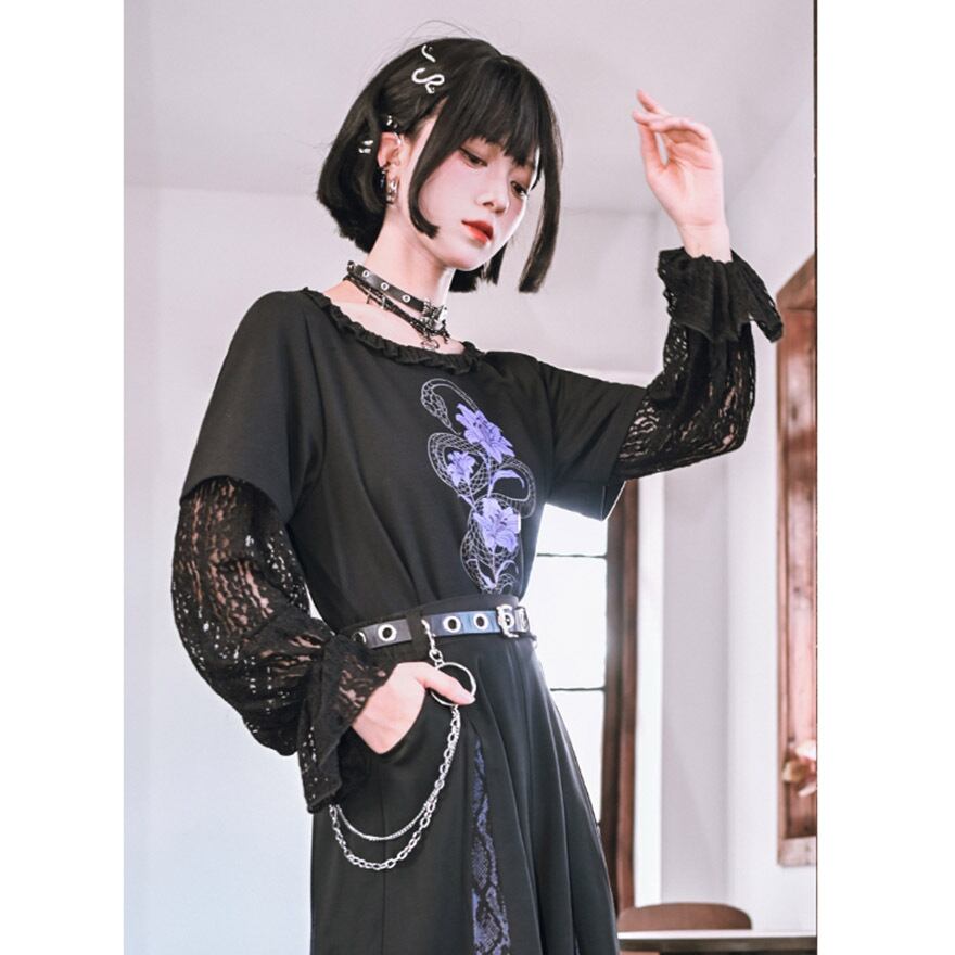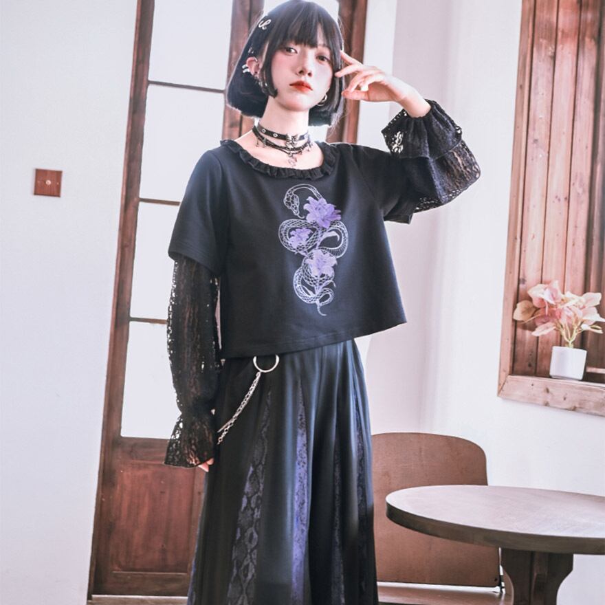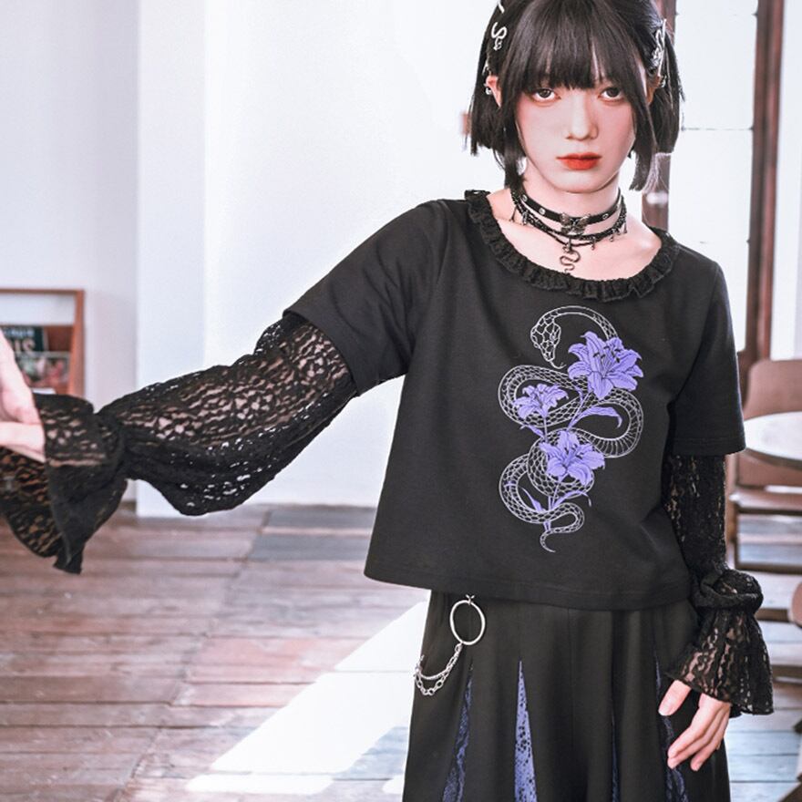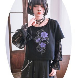 関連キーワード: #チャイナ #中華風 #サブカル #地雷系 #パンク #ゴシック #ストリート #Tシャツ #レイヤード #フェイクツーピース #レース #シースルー #蛇 #スネーク #プリント #クロップド丈 #ショート丈 #黒 #ブラック #パープル #参戦服 #甘辛ミックス