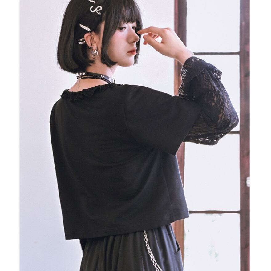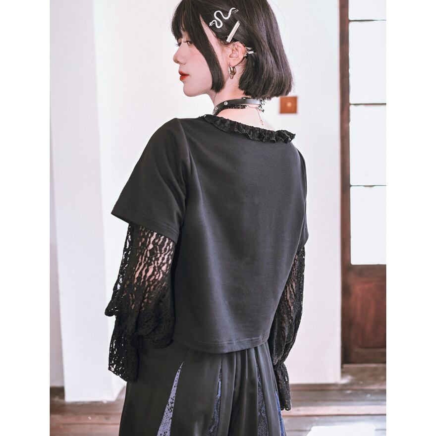 黒の半袖Tシャツに、繊細な花柄レースの長袖をドッキングした、フェイクツーピースデザインのトップスです。