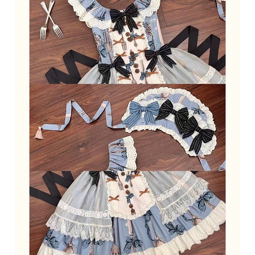 深いネイビーを基調とした生地に、音符や蝶が舞う幻想的なプリントが施されたロリータワンピースです。