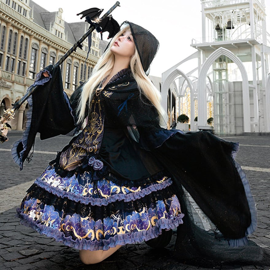 黒を基調に、夜空を思わせる神秘的なパープルのプリントが施された魔女風ロリータドレスです。
