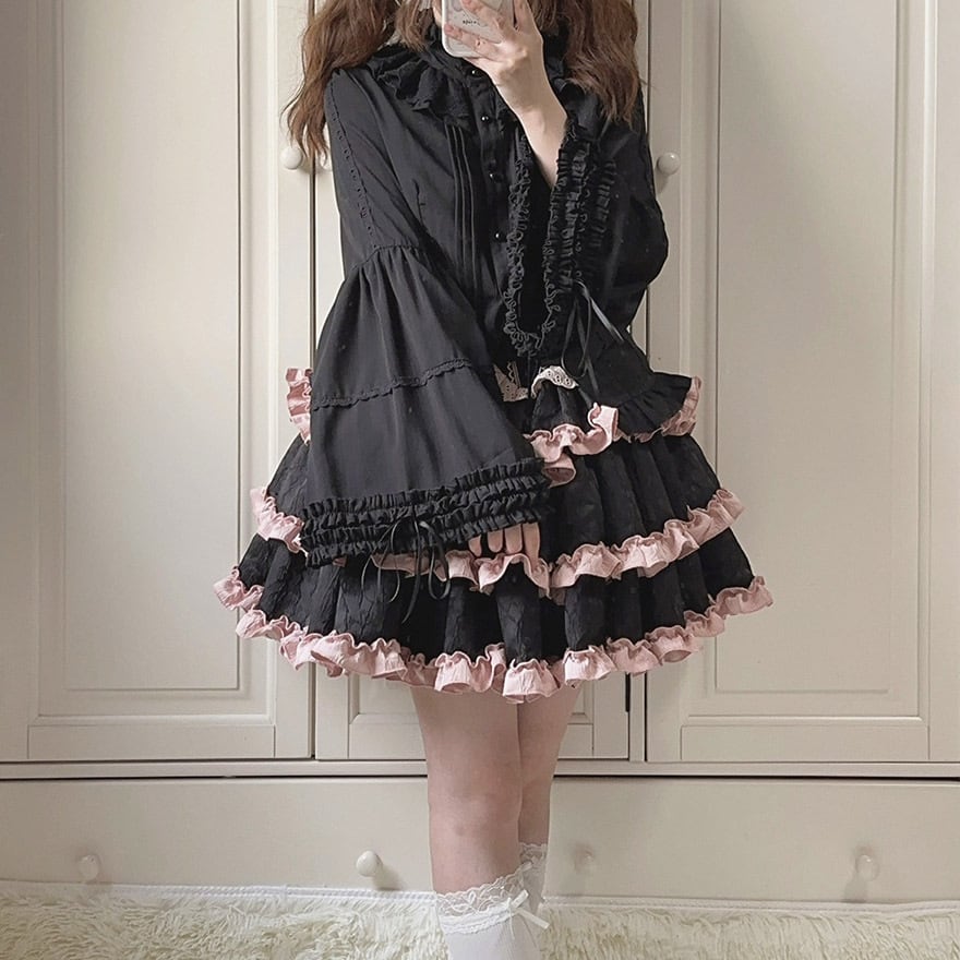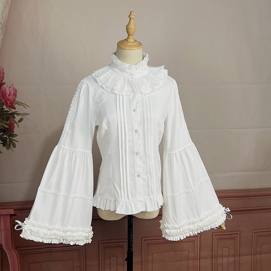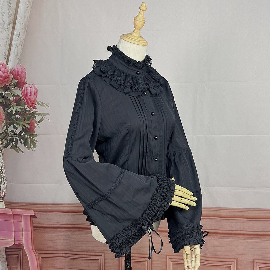 関連キーワード: #ゴスロリ #ロリータファッション #クラロリ #姫袖 #ブラウス #トランペットスリーブ #スタンドカラー #フリル #レース #エレガント #可愛い