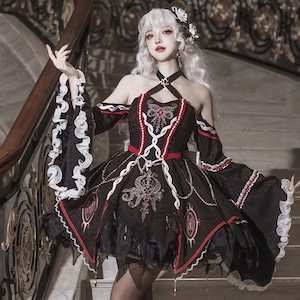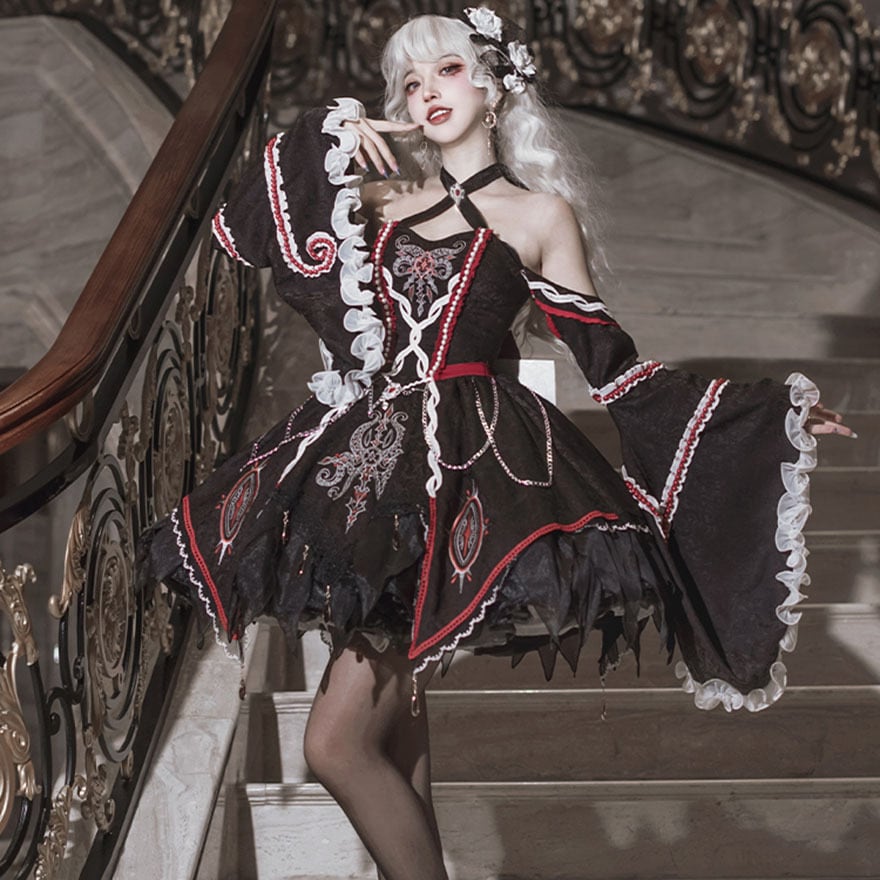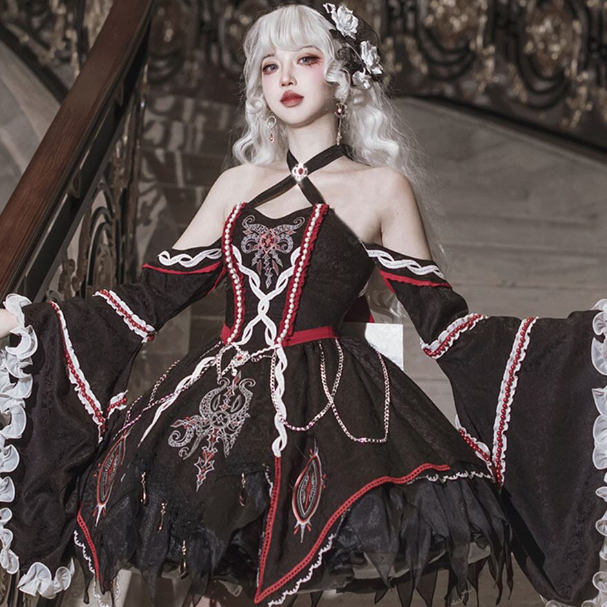 ブラックを基調に、深紅と純白のアクセントが映える、ダークで幻想的なゴシックロリータドレスです。