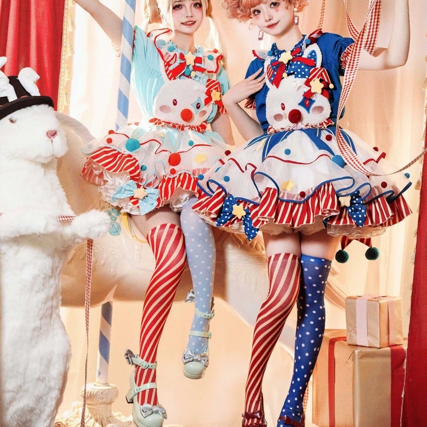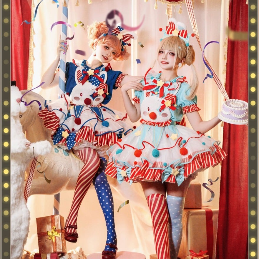 賑やかなサーカスモチーフの可愛らしいジャンパースカートにニーハイソックス、ブラウス、ピエロ帽の4点フルセットです。